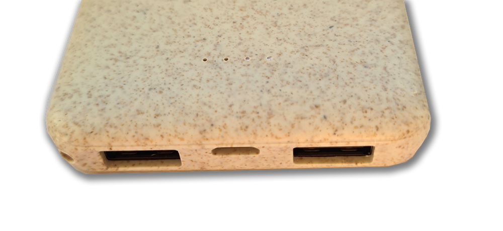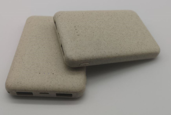 Powerbank gemaakt van milieuvriendelijk tarwestro met dubbele oplaadpoort. Formaat: 90 x 63 x 13 mm. Vermogen: 5000 mAh Uitgang 1: 1,5V/2A, Uitgang 2: 2,5V/2A. Meegeleverd: Micro-USB-kabel en printen in één positie. Verpakking: witte vouwdoos.