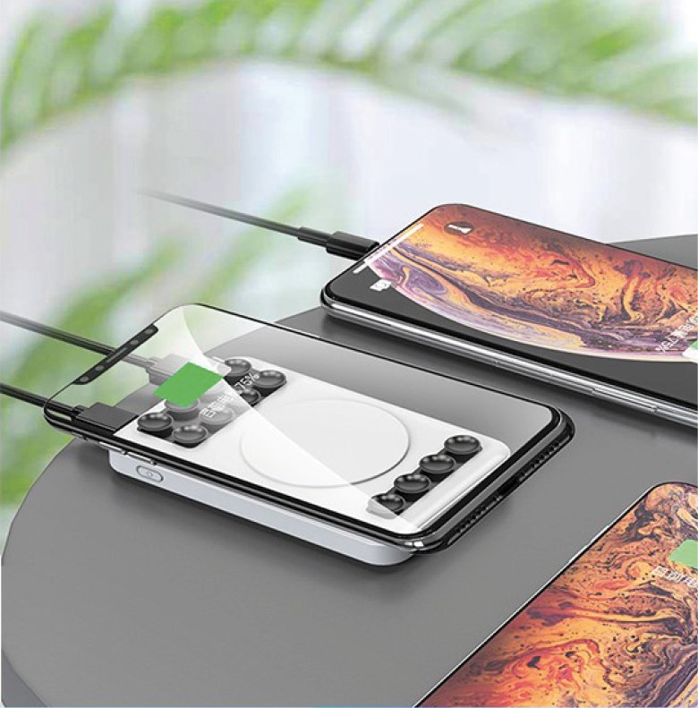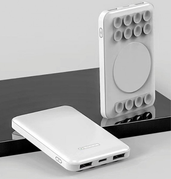 Mobiele oplader met inductielader en zuignappen voor bevestiging Formaat: 63 x 99 x 15 mm. Functies: oplaadbare lithium-polymeerbatterij met geïntegreerde draadloze oplader, mobiele apparaten kunnen met of zonder kabels worden opgeladen, met praktische zuignappen voor bevestiging, dubbele oplaadpoort. Kleuren: zwart, wit. Vermogen: 5 W. Capaciteit: 5000 mAh, Uitgang: 5 V - 2 A, 9 V-2 A, Ingang: 5 V - 2,1 A, Ingangen: 2 x USB, Micro-USB, USB-C. Inbegrepen: Micro-USB-kabel en 1c-printen in één positie. Max. Verpakking: witte vouwdoos.