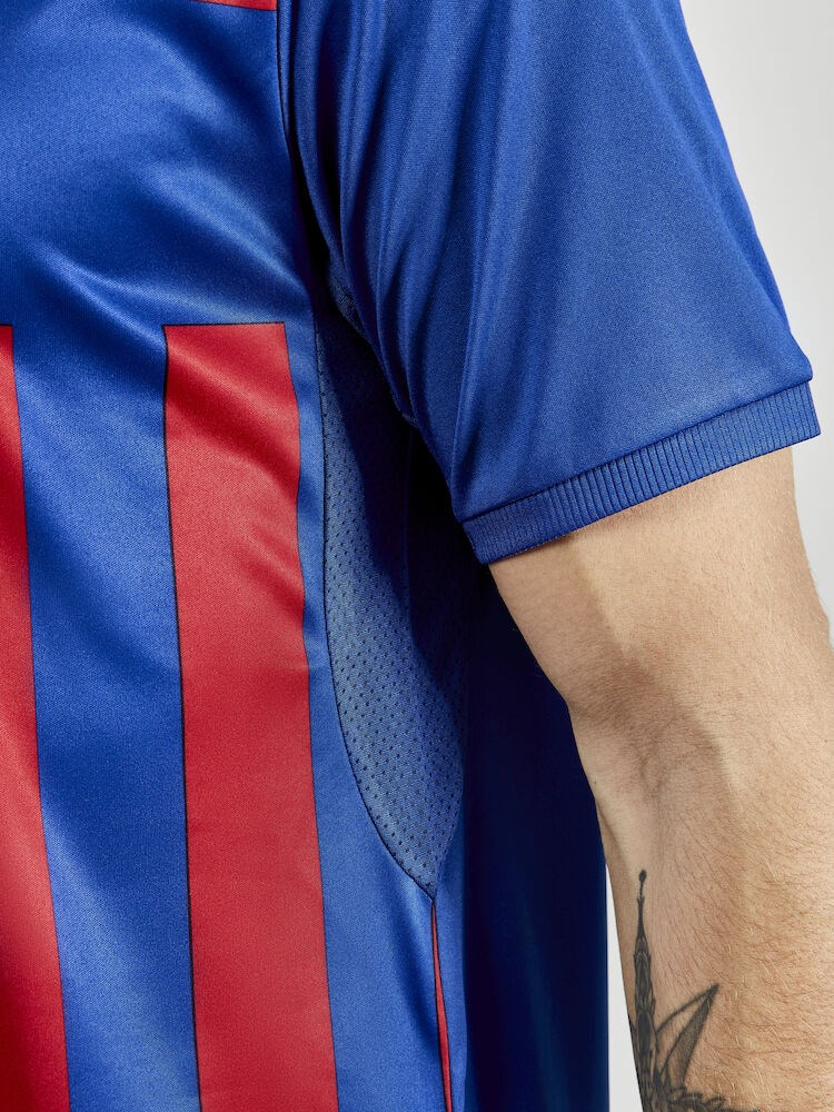 Progress 2.0 Stripe Jersey is an advanced match jersey made of stretchy and functional fabric offering superior moisture transport for maximum performance. Comes with vertical stripe design at front, solid back and a solid horizontal yoke across the chest for optimal impact of crest and/or logos. In addition, mesh panels at the armpits provide efficient body-temperature management while great elasticity ensure comfortable fit and optimal freedom of movement. • Striped front, solid back and solid horizontal yoke across the chest • Lightweight and functional fabrics • Mesh at armpits for enhanced ventilation • Rib-knit collar and sleeve ends • Recycled Polyester for a reduced environmental footprint