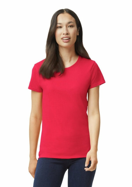 Gildan Heavy Cotton dames T-shirt met korte mouw. Het katoen wat in het shirt is verwerkt is van gecertificeerd U.S. Cotton. Door de comfortabele pasvorm en een goede prijs-kwaliteitverhouding perfect te gebruiken als basis T-shirt.