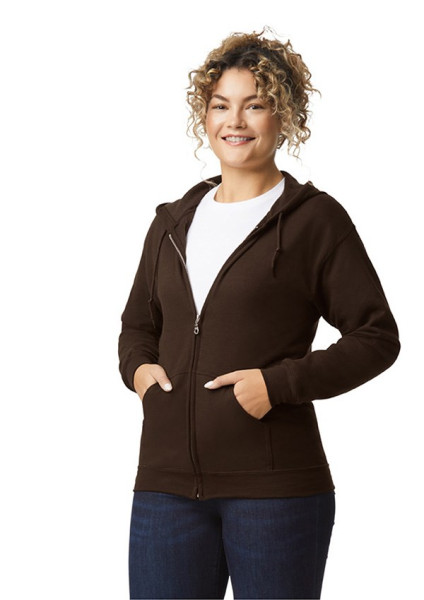 Gildan Heavy Blend unisex vest met ongevoerde capuchon met bijpassend trekkoord. Het vest heeft een metalen rits, buidelzakken en boorden in een elastaan kwaliteit. Het verwerkte katoen is van gecertificeerd U.S. Cotton.