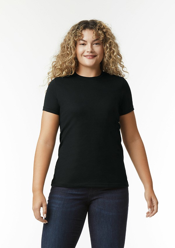 Gildan Softstyle CVC (Chief Value Cotton) T-shirt voor dames met korte mouw gemaakt van 60% ringgesponnen katoen en 40% polyester. Glad printoppervlak door de hoge steekdichtheid. Subtiele heather textuur bij alle kleuren, behalve Pitch Black en White