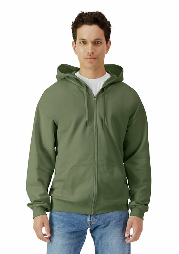 Gildan Softstyle Midweight Unisex Zip Sweater met capuchon, buidelzak en metalen rits. Met een geborstelde binnenkant met een 100% katoenen buitenkant, ideaal voor DTG-printen. Ook verkrijgbaar in een ronde hals en hoodie uitvoering