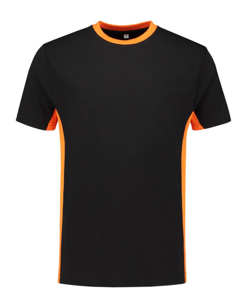 Lemon & Soda workwear unisex T-shirt met korte mouwen en ronde hals. Contrast kleuren bij de halsopening enzijkanten van het T-shirt. Behandeld met een bio-wassing voor extra glad oppervlakte.