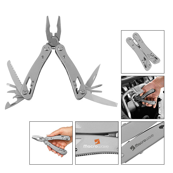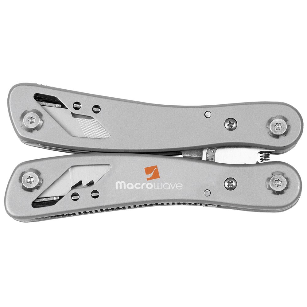 Multitool met 11 functies. Materiaal: gezandstraald 2Cr13 roestvrij staal, ABS handvat. Gereedschap: nijptang, standaardtang, draadschaar, houtzaag, 2 x sleufschroevendraaier (3/5), priem, blikopener, vijl, kruiskopschroevendraaier (PH1), mes (bladlengte: 48 mm). Verpakking: zwarte geschenkdoos.