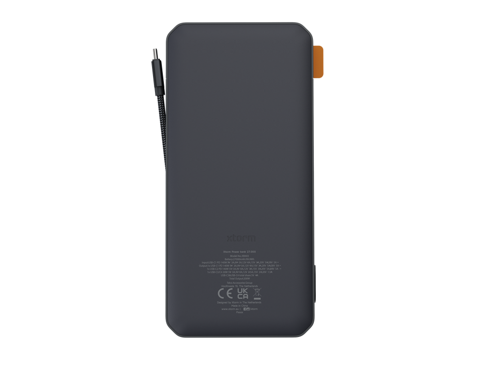 Met zijn grote capaciteit van 27.000mAh kan de XB403 Titan Ultra gemakkelijk je USB-C laptop, MacBook, tablet, smartphone of e-reader snel opladen. Met een gecombineerde totale output van 200W en de 140W USB-C PD single output, is deze Titan Ultra de premium en meest krachtige Powerbank binnen de XB4-serie. Dankzij de geïntegreerde 240W USB-C PD kabel ben je altijd en overal klaar om je apparaten op te laden. Door de snellaadfunctie zijn jouw smartphone, tablet of laptop binnen no-time weer volledig opgeladen.