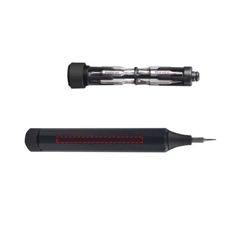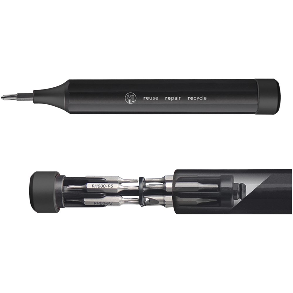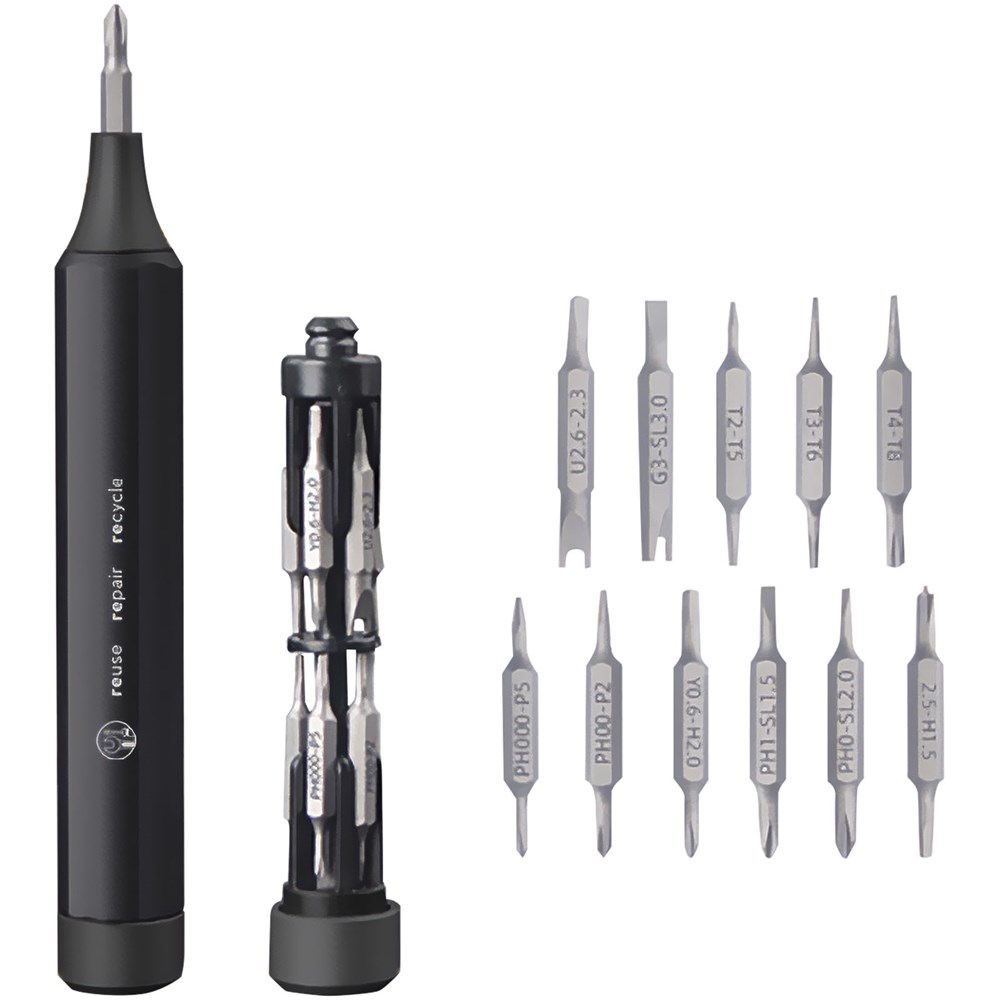 Precisie schroevendraaierset in aluminium, voorzien van daarin verborgen 10-dubbelkoppige bits. De verschillende bits worden met een magnetische functie aan de schroevendraaierpen bevestigd en zijn geschikt voor de meeste technische apparaten. Dit product is aanpasbaar met lasergraveren. Geleverd in een geschenkverpakking van gerecycled papier.
