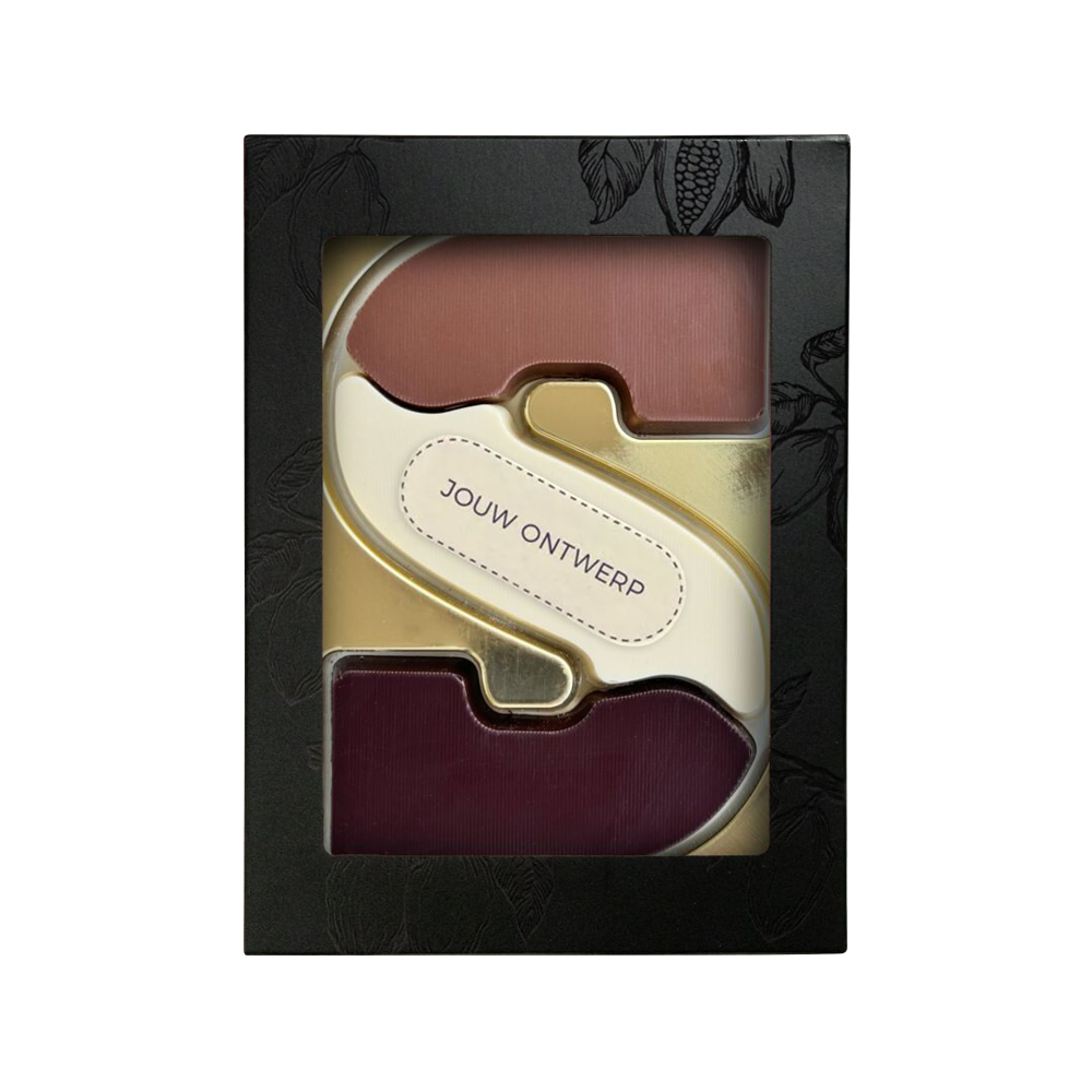 De lekkerste logoletter van Nederland, gemaakt van Cocoa Horizons-Certified melk-, witte en pure chocolade van het Belgische topmerk Barry Callebaut | Voor de twijfelaars, drie smaken in 1 letter van 200 gram | Een bedrijfslogo, naam of kleine wenstekst geprint op een marsepeinen schildje | Met cacaoboter wordt het marsepeinen logoschildje op de letter bevestigd | Alleen verkrijgbaar als letter S | Direct uit voorraad leverbaar |Afname > 10.000 stuks, prijs op aanvraag | Te bestellen in veelvouden van 10 stuks | Snelle levering | Gratis sample
