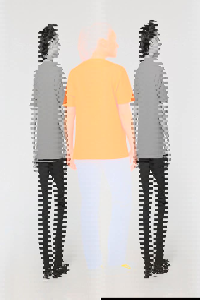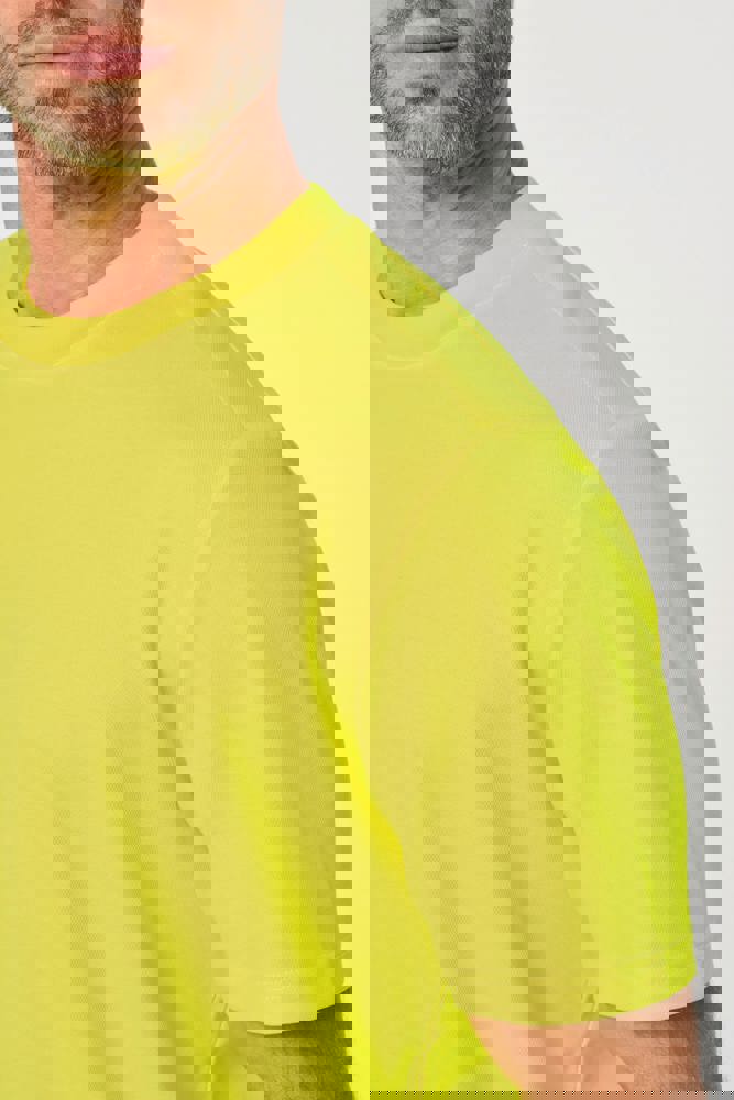 60% katoen / 40% gerecycled polyester. Gekamd katoen. Interlock piqué. Industrieel en/of huishoudelijk wasbaar op 60°C. Regular fit. 1x1 gevoerde ribkraag. Nektape aan binnenkant kraag. Versteviging aan de binnenkant van de schouders in keperstof (65% polyester / 35% katoen) om vervorming te voorkomen bij industriële wasbeurten. RFID-zakje aan de onderkant van het kledingstuk onder het label. Dubbele stiksels bij de mouwen en onderkant van het kledingstuk. PBM Klasse II - Normen NF EN ISO 13688:2013 + NF EN ISO 13688/A1:2021 (Beschermende kleding - Algemene eisen), NF EN 17353:2020: Type A (Beschermende kleding - Verhoogde zichtbaarheid voor situaties met matig risico - Testmethoden en eisen), NF EN ISO 15797:2018 (Textiel - Industriële was- en afwerkingsmethoden voor het testen van werkkleding): Professioneel industrieel wassen - Wasmethode programma 8 met alleen tunnelafwerking. Geweven merketiket.