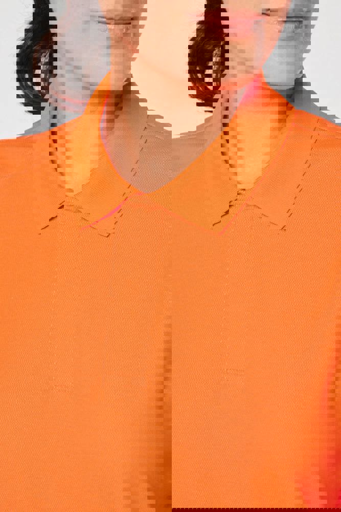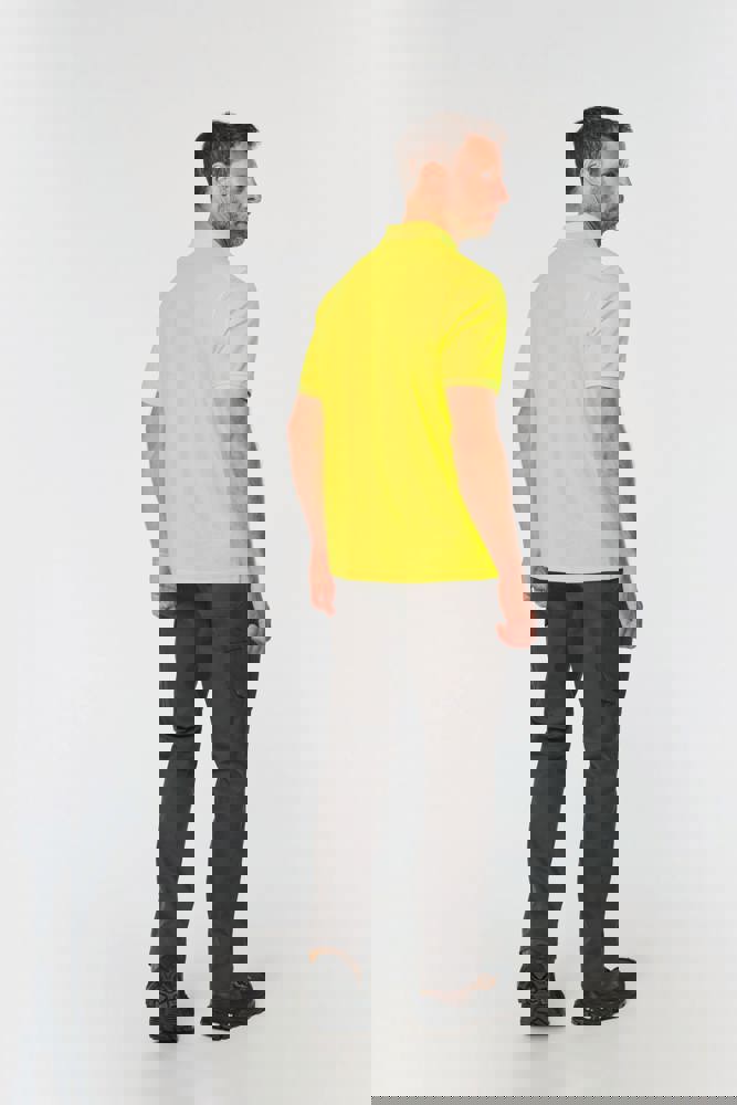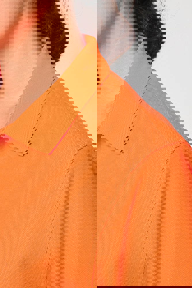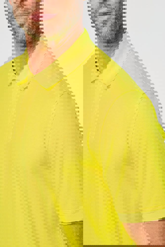 60% katoen / 40% gerecycled polyester. Gekamd katoen. Interlock piqué. Regular fit. Industrieel en/of huishoudelijk wasbaar op 60°C. Tunnel drogen. Kraag en mouwboorden van 1x1 rib. Nektape aan de binnenkant. Kraagsluiting met 2 verborgen drukknoopjes onder de sluiting. Verstevigingen aan de binnenkant van de schouders in keperstof (65% polyester / 35% katoen) om vervorming bij industriële wasbeurten en tunneldrogen te voorkomen. RFID-zakje aan de onderkant van het kledingstuk onder het label. Dubbele stiksels aan de onderkant van het kledingstuk. PBM Klasse II - Normen NF EN ISO 13688:2013 + NF EN ISO 13688/A1:2021 (Beschermende kleding - Algemene eisen), NF EN 17353:2020: Type A (Beschermende kleding - Uitrusting voor verbeterde zichtbaarheid in situaties met matig risico - Testmethoden en eisen), NF EN ISO 15797:2018 (Textiel - Industriële was- en afwerkingsmethoden voor het testen van werkkleding): Professioneel industrieel wassen - Wasmethode programma 8 met alleen tunnelafwerking. Geweven merketiket.