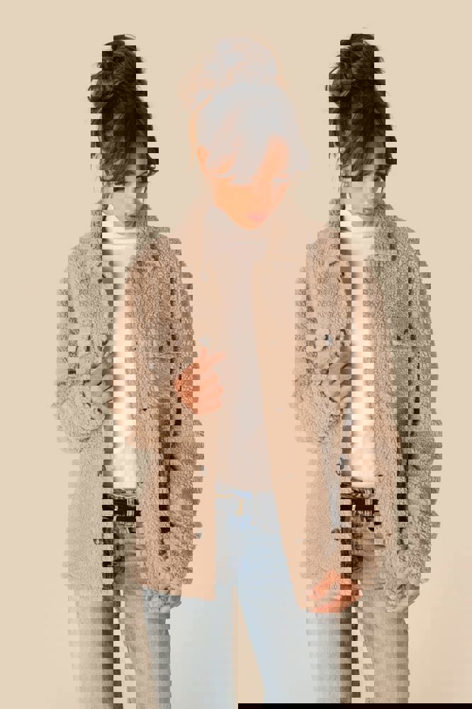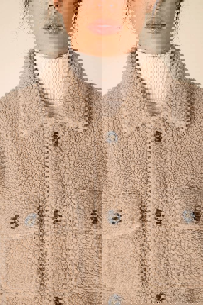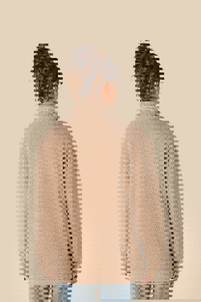 100% polyester. Regular fit met afhangende schouders. Sherpastof met voering van de body in jersey en voering van de mouwen in taffetas, voor makkelijk aantrekken. Kraag gevoerd met de hoofdstof. Knooplijst en borstzakjes met klep die sluiten met plastic knopen met hoornlook. De hals is binnenin afgewerkt met ton-sur-ton nektape met kepermotief. De mouwuiteinden en de zoom zijn afgewerkt met enkel stiksel. Drukkersrits aan de binnenkant onderaan.