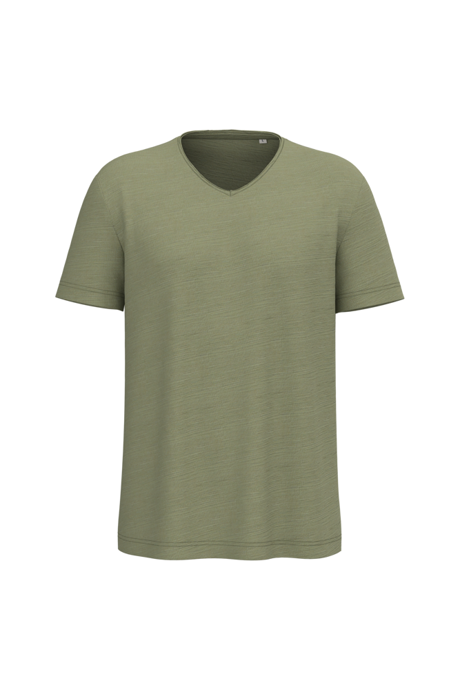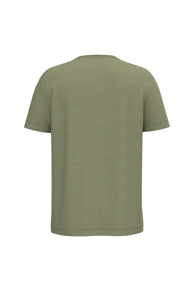 100% biologisch katoen. Gekamd katoen. Jerseytricot met gevlamd effect. Regular fit met afhangende schouders. Enzymgewassen. Zijnaden. V-hals met onafgewerkte boorden in de hoofdstof. Schouderversteviging. De hals is aan de binnenkant afgewerkt met ton-sur-ton nektape in de hoofdstof. Mouwuiteinden en onderkant met dubbel stiksel.