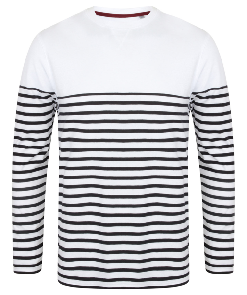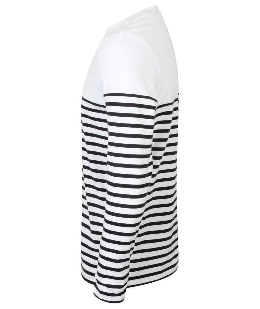 100% jerseykatoen. Dik, unisex T-shirt met lange mouwen, klassiek model zonder etiket. Ronde hals met rekbare ribboord. Zoom en naad van de mouwen in dubbel stiksel. V-vormig, plat naaimotief aan de halsopening. Het onderste deel is gestreept.