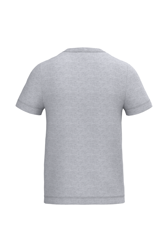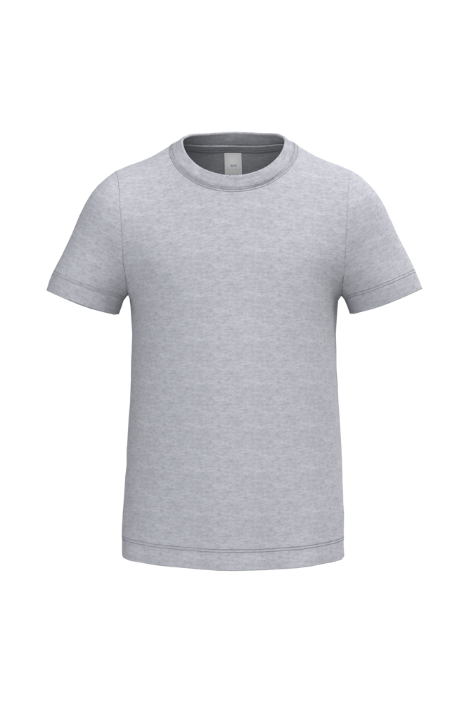Effen kleuren: 100% katoen. Kleur Ideal Ash Heather: 99% katoen / 1% viscose. Kleur Ideal Oxford Grey: 90% katoen / 10% viscose. Cut & sewn jersey van maat 1/2 t/m 6/8 en tubulair van maat 8/10 t/m 12/14. Rechte snit. Ronde hals in 1x1 ribboordafwerking met dubbele stiksels. Toon-op-toon nektape aan de binnenzijde. Mouwboorden en zoom afgewerkt met dubbele stiksels. Afneembaar merklabel.