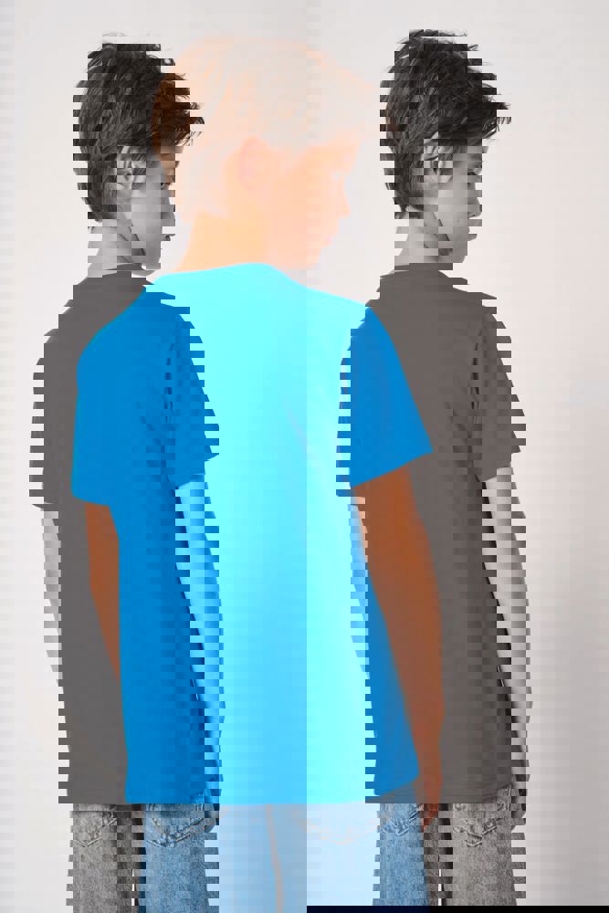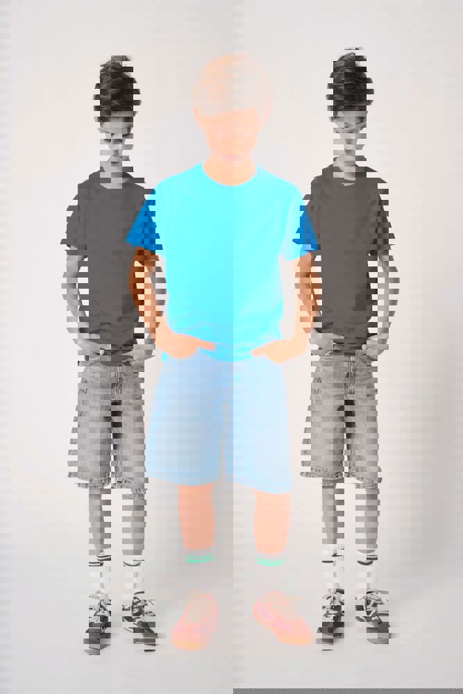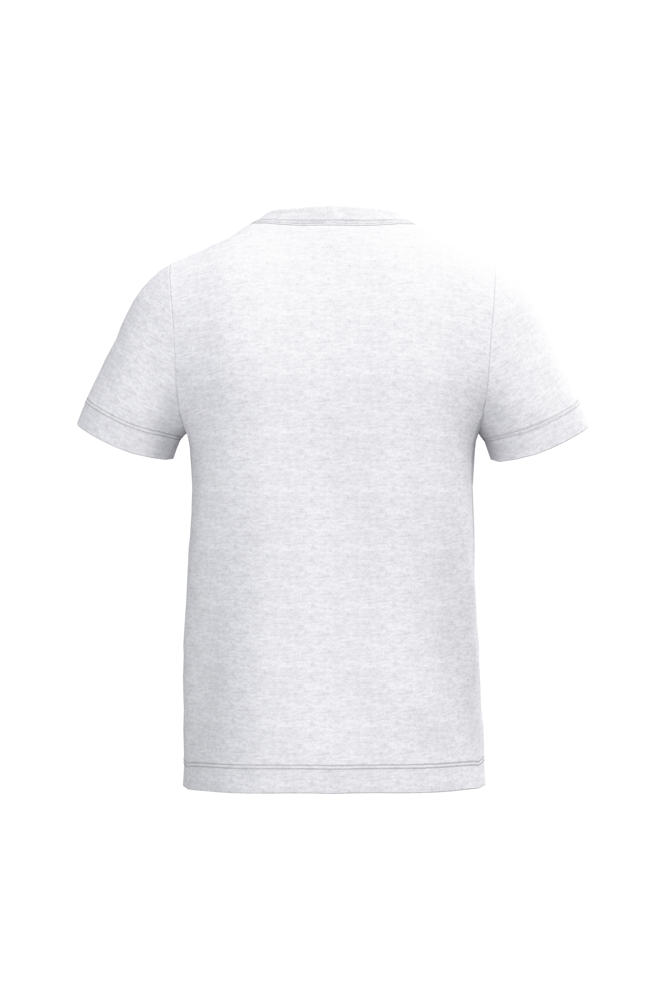 Effen kleuren: 100% katoen. Kleur Ideal Ash Heather: 99% katoen / 1% viscose. Kleur Ideal Oxford Grey: 90% katoen / 10% viscose. Cut & sewn jersey van maat 1/2 t/m 6/8 en tubulair van maat 8/10 t/m 12/14. Rechte snit. Ronde hals in 1x1 ribboordafwerking met dubbele stiksels. Toon-op-toon nektape aan de binnenzijde. Mouwboorden en zoom afgewerkt met dubbele stiksels. Afneembaar merklabel.