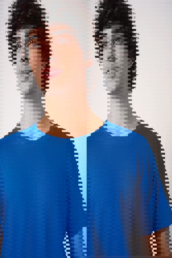 Effen kleuren: 100% katoen. Kleur Ideal Ash Heather: 99% katoen / 1% viscose. Kleur Ideal Oxford Grey: 90% katoen / 10% viscose. Tubulaire jersey. Rechte snit. Ronde hals in 1x1 ribboordafwerking met dubbele stiksels. Toon-op-toon nektape aan de binnenzijde. Mouwboorden en zoom afgewerkt met dubbele stiksels. Afneembaar merklabel.