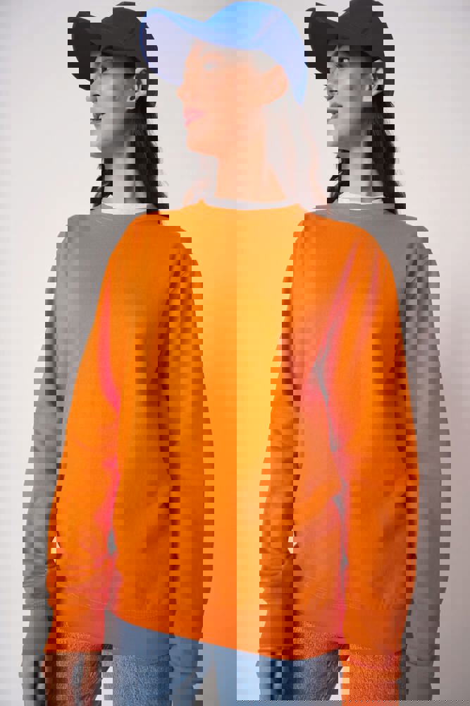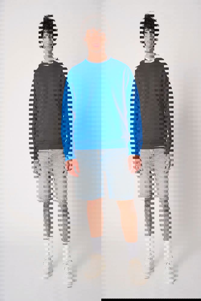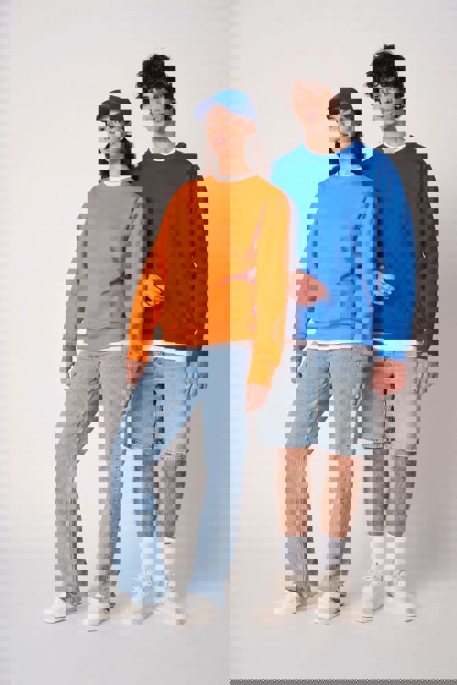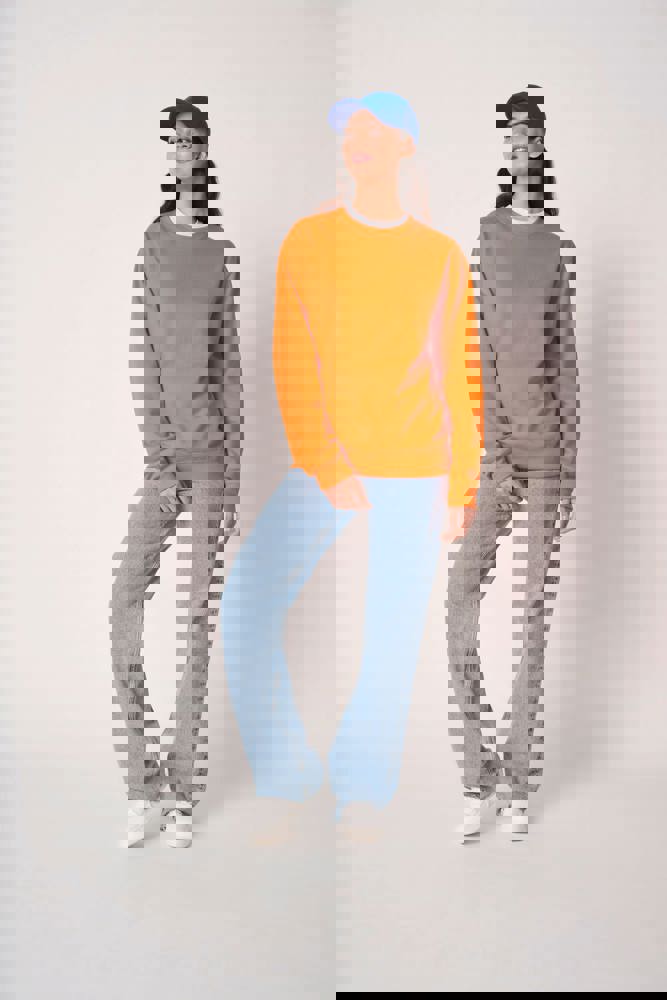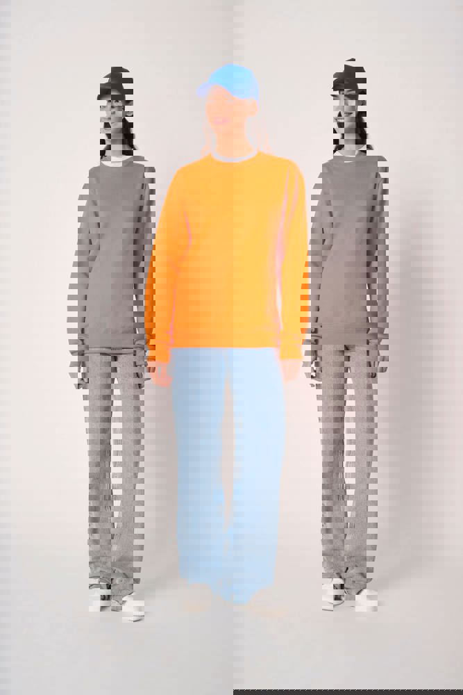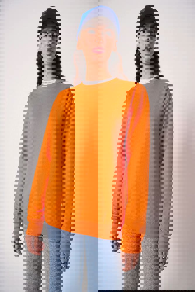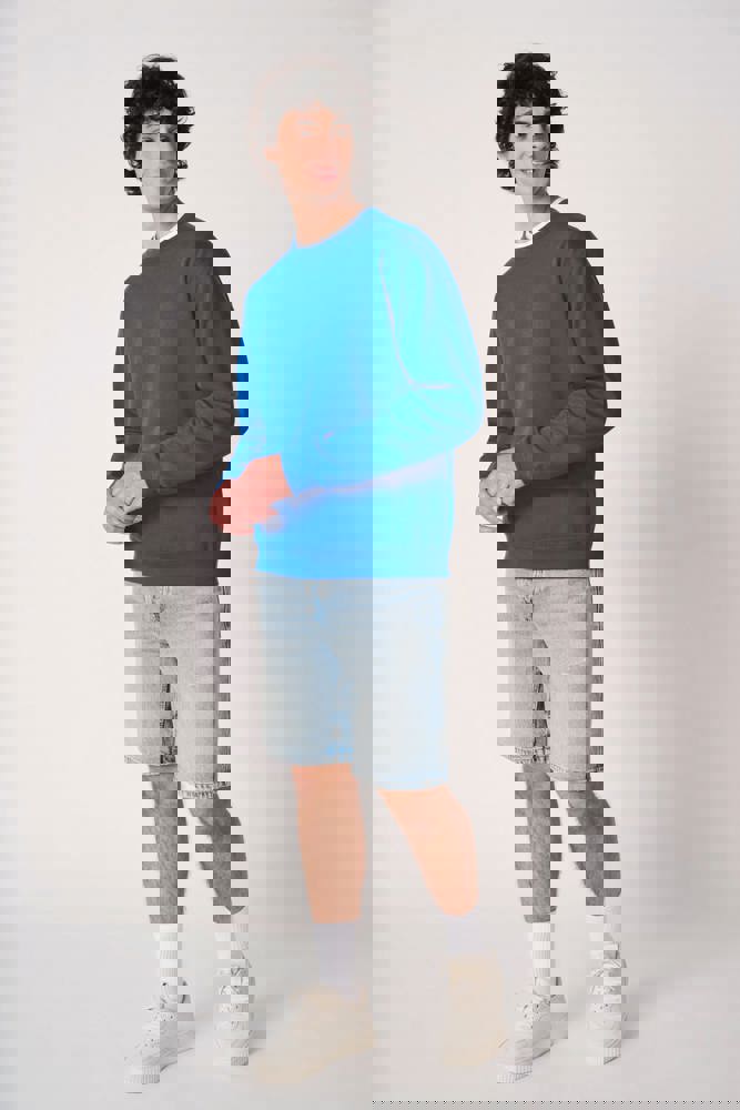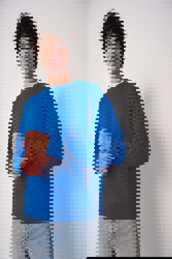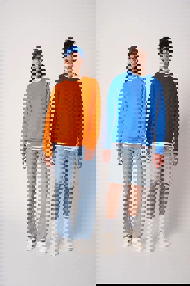 50% katoen / 50% polyester. Geruwd molton, tubulair geweven. Rechte snit. Hals, mouwboorden en zoom in 1x1 ribboord met dubbele stiksels. Afneembaar merklabel.