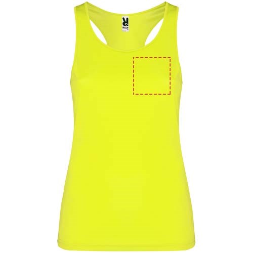 Technische, ademende, gemakkelijk te wassen en te drogen stof. Geribde armsgaten en halslijn. Racerback en zijnaden. Verwijderbaar label.
