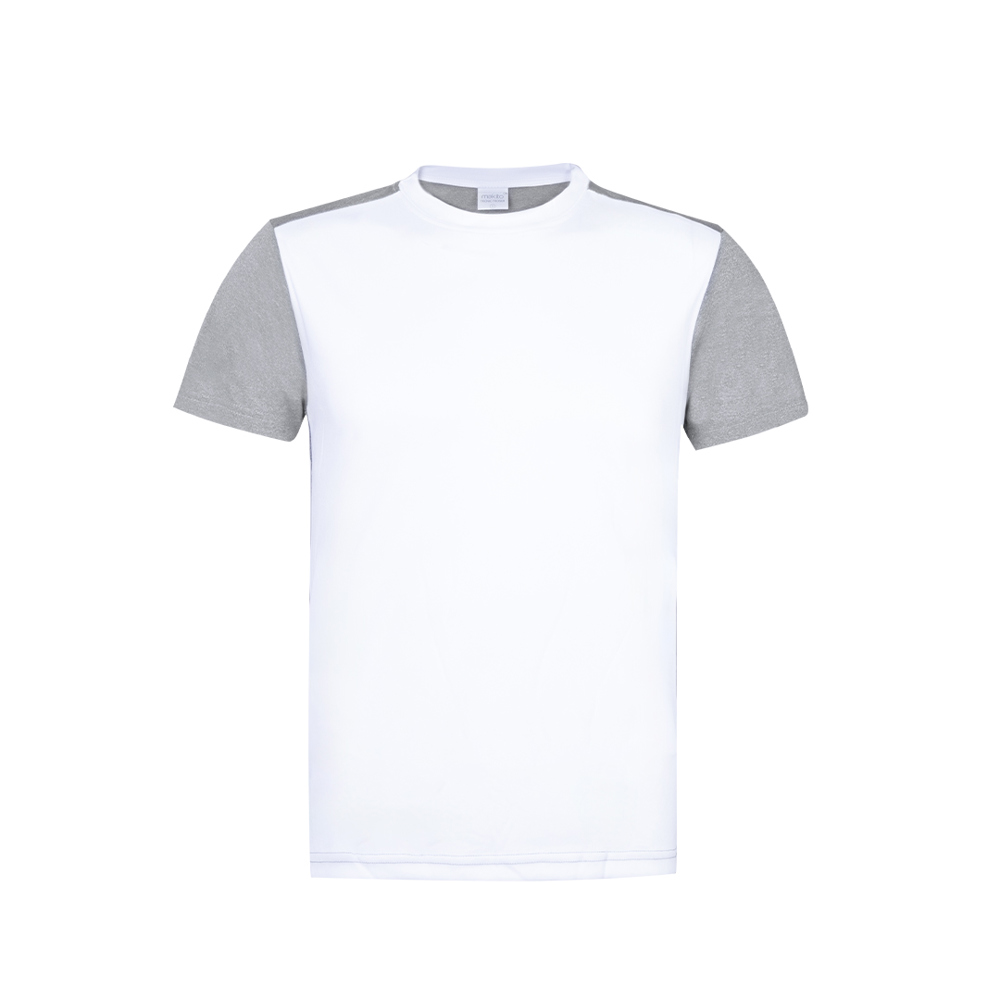 Technisch t-shirt voor volwassenen in ademend polyester/elastaan 135g/m2. In een elegant tweekleurig ontwerp, met body in witte kleur, achterkant en details in grijs. Verkrijgbaar in de maten S, M, L, XL, XXL. Witte kleur speciaal vervaardigd voor sublimatiebedrukking.