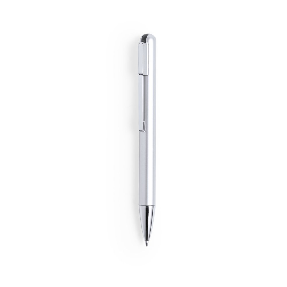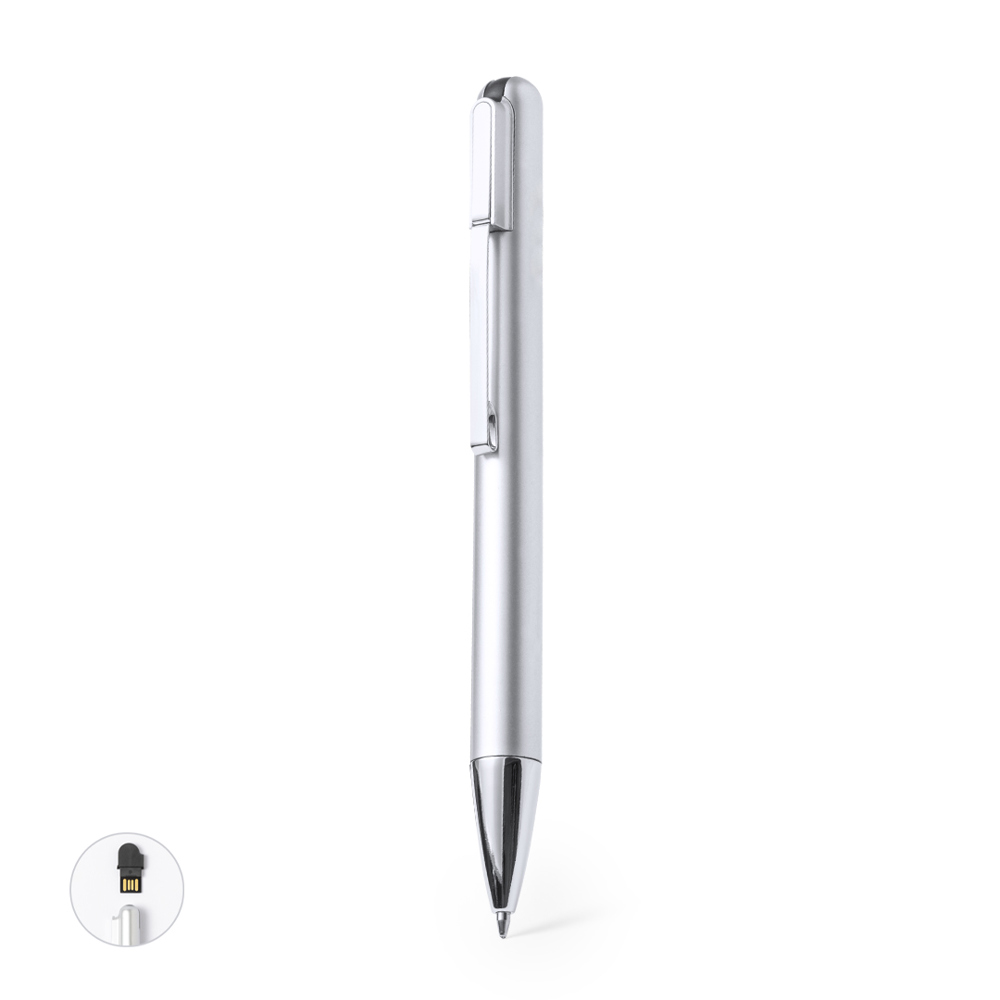 USB-balpen van duurzaam ABS met glanzende metalen afwerking. Met 16GB USB-stick geïntegreerd aan de bovenkant en metalen clip. Draaimechanisme, jumbo cartridge en blauwe inkt. Gepresenteerd in een individuele zwarte doos.