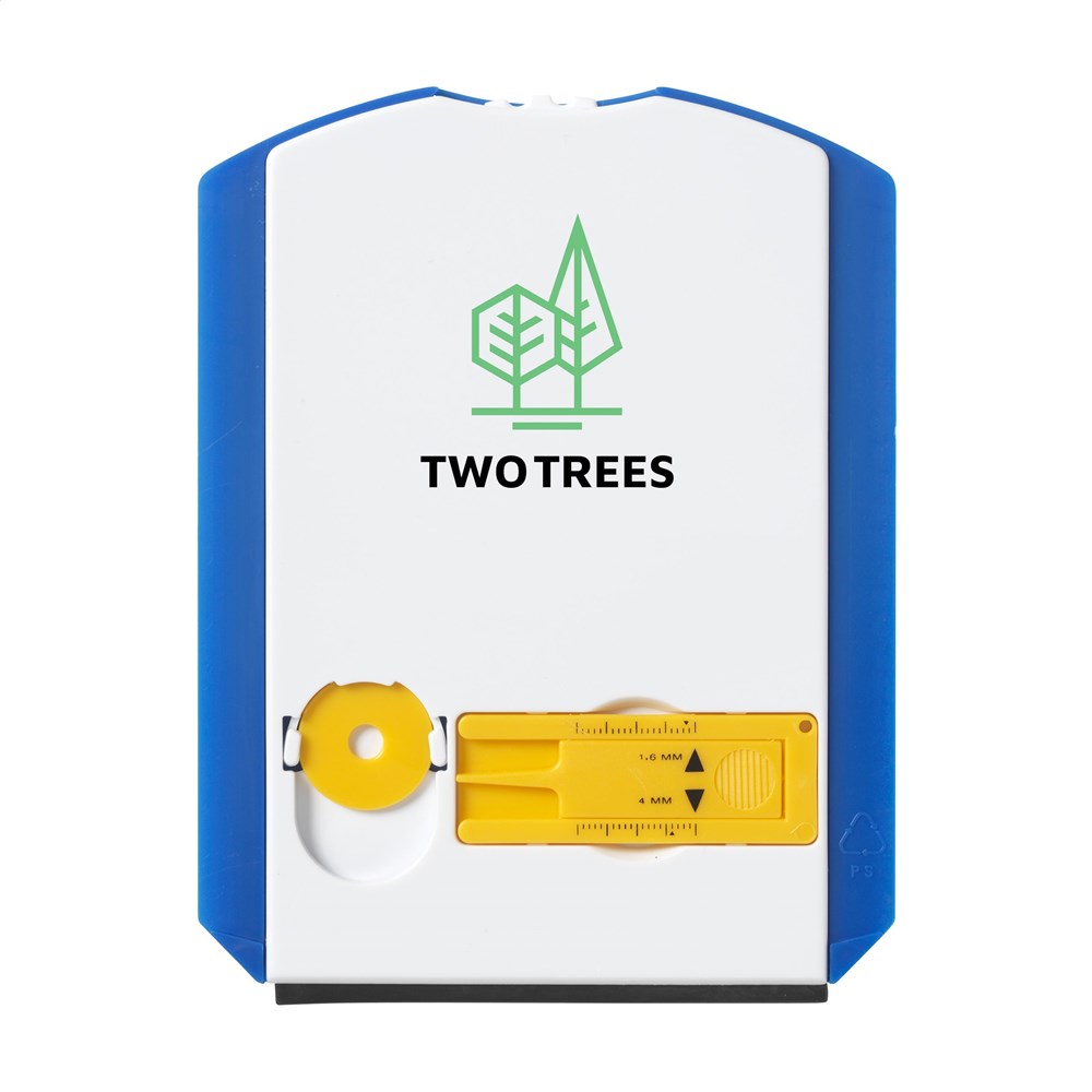 Kunststof parkeerschrijf met ijskrabber, rubberen ruitenwisser, 1 winkelwagenmuntje en bandenprofielmeter.