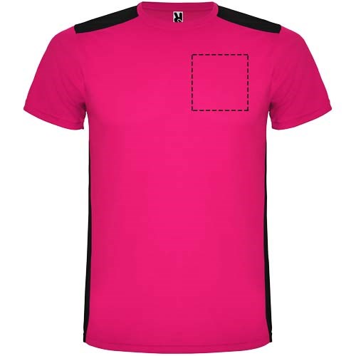 Gemakkelijk drogende, technische en ademende stof. Ronde hals. Combinatie van twee polyesterstoffen op de rug en schouders. Birdseye-stof aan de voorkant en ademende 3D-meshstof aan de achterkant. Stof voorbereid voor vochtopname. Decoratieve zigzagsteek aan de zijkanten en schouders. Rugpatroon is iets langer. Verwijderbaar label.