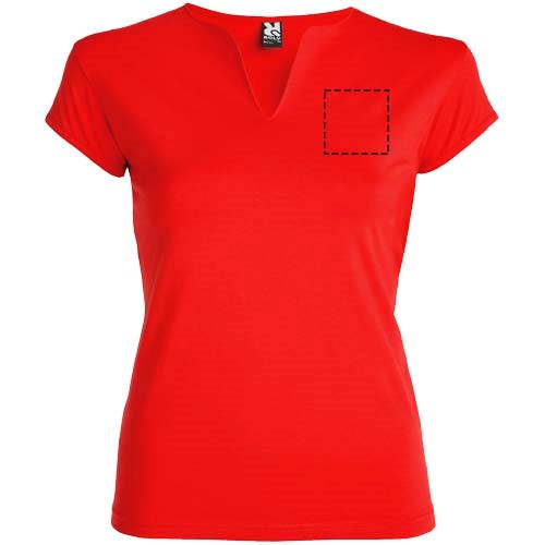 Getailleerd T-shirt met ronde hals en V-opening aan de voorkant. Afgezette halve mouw en zijnaden. Hoogwaardige stof voor een zachte en aangename touch. Verwijderbaar label. Het model is 179 cm en draagt maat S.