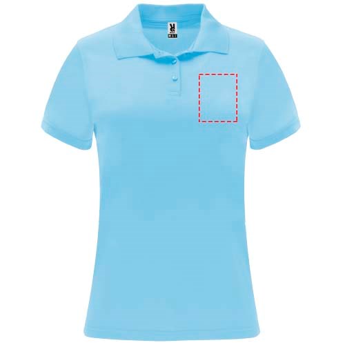 Technisch poloshirt met korte mouwen voor dames. Gebreide kraag met sluiting met drie knopen. Getailleerde snit. Ademende, gemakkelijk wasbare en droge stof. Verwijderbaar etiket. Technische stof. Ademende stof. Het model is 173 cm en draagt maat S.
