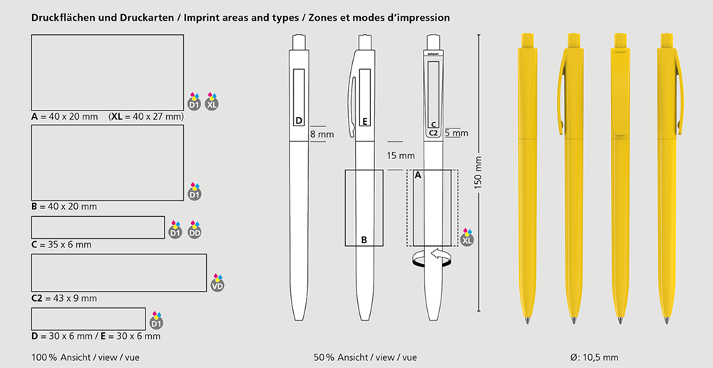De Qube high gloss is een Drukknop-balpen. Materialen en oppervlakken: Schacht, bovendeel en drukknop: Kunststof (ABS) hoogglanzend, Navulbuis: Gerecycled polypropyleen (rPP). Standaard kleuren: Schacht, bovendeel en drukknop: te combineren uit 14 kleuren. : vanaf 5000 stuks; vanaf 25.000 stuks zonder PMS-toeslag. Standaard vulling: Silktech L (3 000 m), blauw of zwart, vulling optioneel: Silktech XL, Multifill P, Multi-Gel.