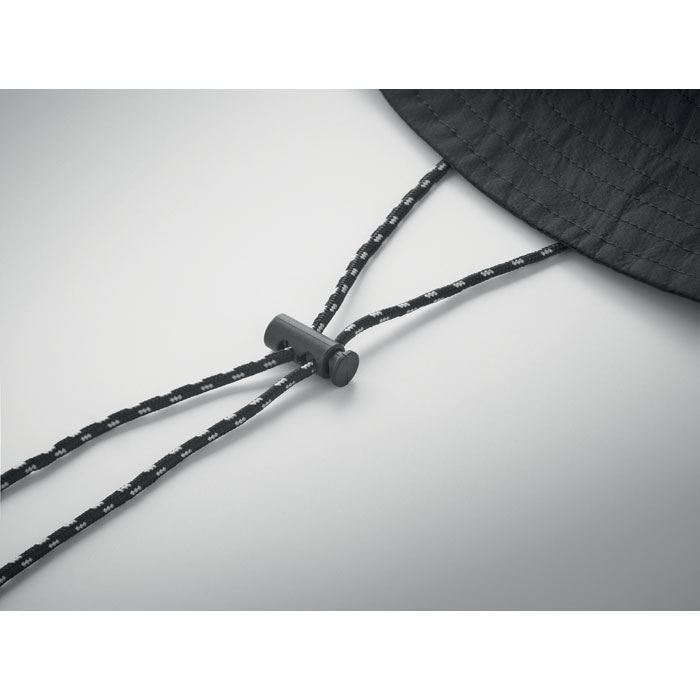 Waterafstotend vissershoedje van polyester, met geïntegreerd zakje aan de binnenkant van hetzelfde materiaal met ABS karabijnhaak. 64g/m².