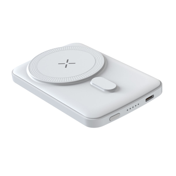 Magnetische powerbank\nMet de ingebouwde magneten kun je deze powerbank eenvoudig bevestigen aan je iPhone 12 of hoger of aan een smartphone met een magnetisch hoesje voor je mobiele telefoon. De powerbank heeft een mooi, modern ontwerp en een hoogwaardige kunststof behuizing die licht, robuust en comfortabel in de hand ligt.\nOndanks het compacte formaat levert hij krachtige prestaties met 5000mAh capaciteit, 15W Qi draadloze output en 20W power delivery (PD) via de USB-C kabel. De nauwkeurig geplaatste magneten hechten zich perfect aan je iPhone en garanderen een stabiele, betrouwbare lading - zonder dat je de oplaadfunctie handmatig hoeft te starten of te stoppen.\nDe magneet heeft geen negatieve invloed op creditcards of bankpassen.\nDeze magnetische powerbank is ook zeer voordelig en daarom ideaal voor iedereen die op zoek is naar een krachtige en toch goedkope oplader.\nTechnische gegevens:\n- Ingang USB-C: 5V/2A, 7,5V/2,5A, 9V/2A\n- Uitgang USB-C: 5V/3A, 9V/2.2A, 12V/1.6A\n- Uitgang USB-A: 5V/3A, 9V/2A, 12V/1.5A\n- Draadloze uitgang: 15W (MAX)\n- PD (Power Delivery): 20W