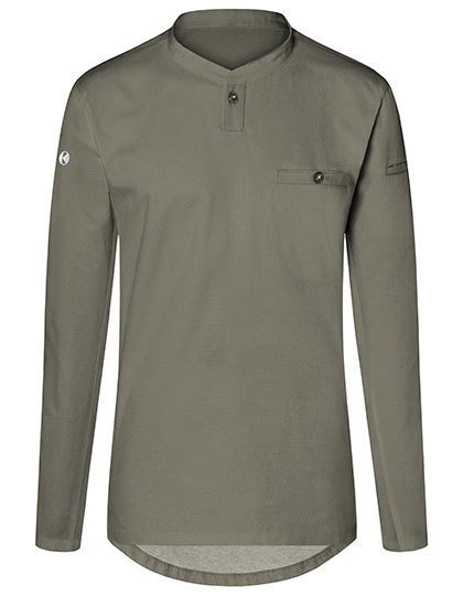 Voorkant: keperstof | Rug: jersey piqué, ademend, vochtregulerend | Lange mouwen | Pasvorm op maat | Halslijn met smalle opstaande kraag en kleine knoopsluiting | Borst paspelzak met knoop | Ingezette zak op linkermouw