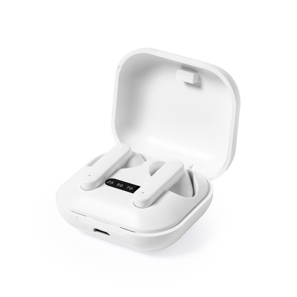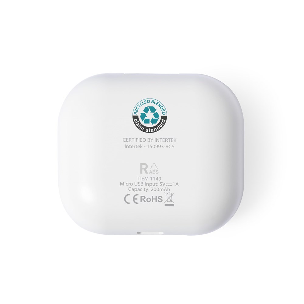 Natuurlijn oortelefoon met Bluetooth® 5.0-verbinding, inclusief lithiumbatterij en in een elegante witte afwerking. Gemaakt van gerecycled ABS (RABS), met RCS-certificaat, dat de gerecyclede oorsprong garandeert. Ergonomisch ontworpen, inclusief een geïntegreerde bedieningsknop op de oortelefoon, met bijpassende oplaadbasis en LED-oplaadstatusindicator. Handsfree-functie en oplaadbaar, met micro USB-kabel inbegrepen. Gepresenteerd in een aantrekkelijke eco-design doos.