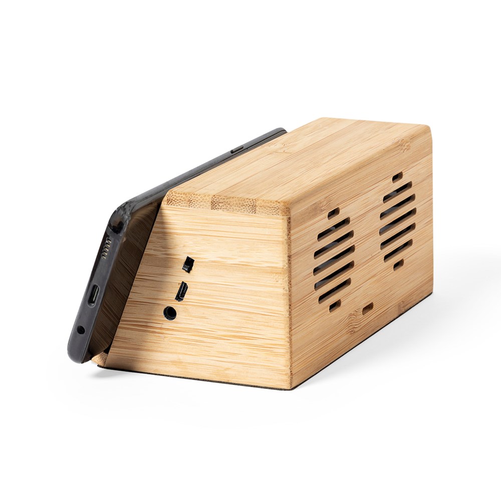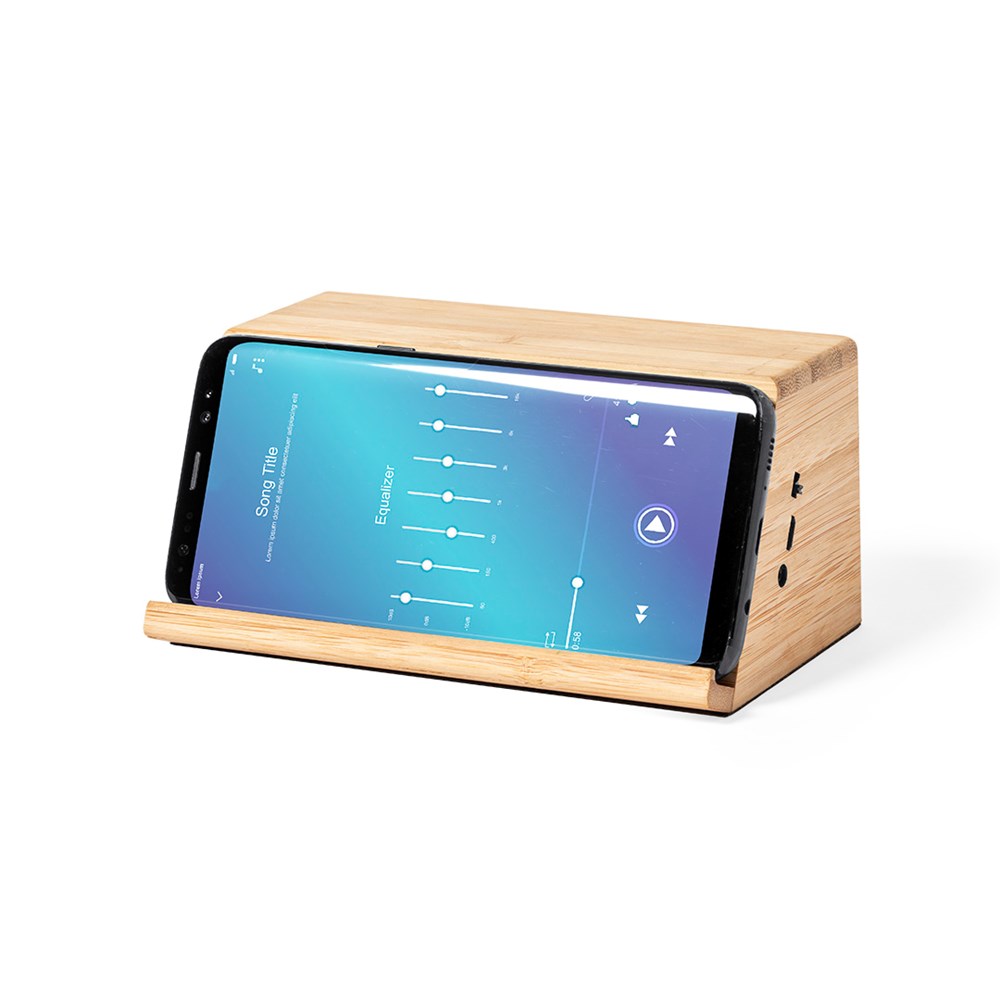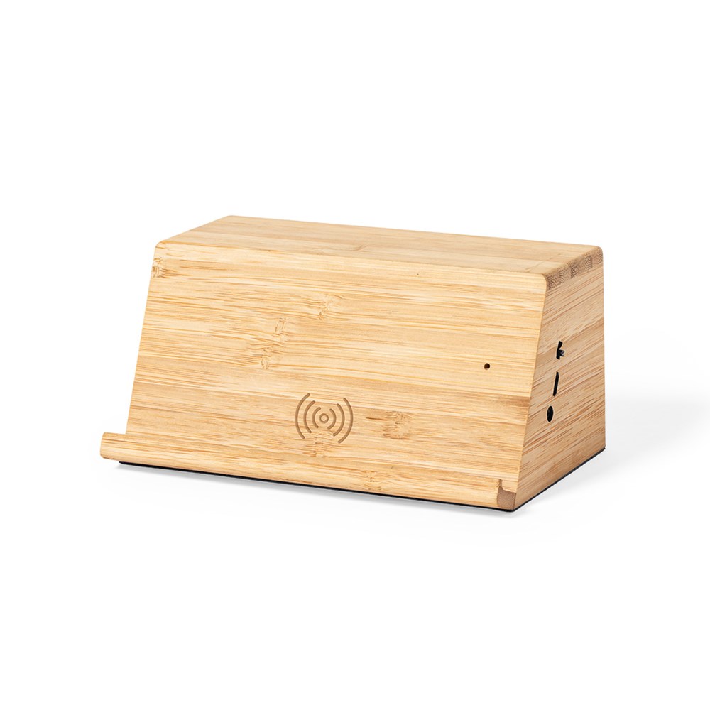 Natuurlijn luidspreker met 10W draadloze inductie lader. Geïntegreerde smartphonehouder en 2 luidsprekers van elk 3W. Gemaakt van bamboe van natuurlijke stekken, met anti-slip basis. Compatibel met apparaten die zijn uitgerust met draadloze oplaadtechnologie en oplaadbaar via USB-kabel -inclusief-. Groot merkoppervlak en gepresenteerd in een aantrekkelijke eco-design doos.
