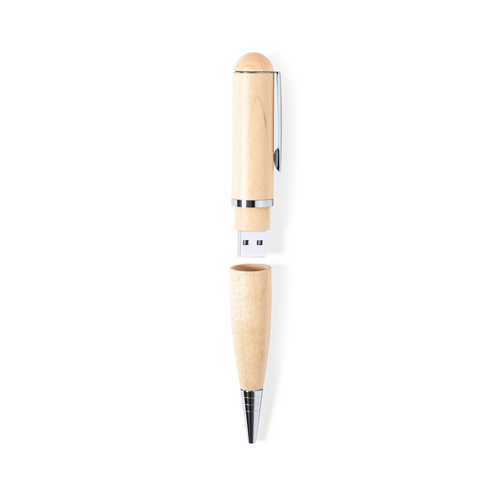 USB balpen in natuur lijn. Met 16GB USB flash drive geïntegreerd in de dop en gemaakt van hout, ter bevordering van het gebruik van natuurlijke materialen. Met draaimechanisme en blauwe inkt. Gepresenteerd in een aantrekkelijk doosje met kraft afwerking.