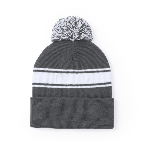 Zachte en warme muts gemaakt van acryl, in diverse kleuren. Origineel ontwerp, met witte strook en tweekleurige pom pom in bijpassende kleur.