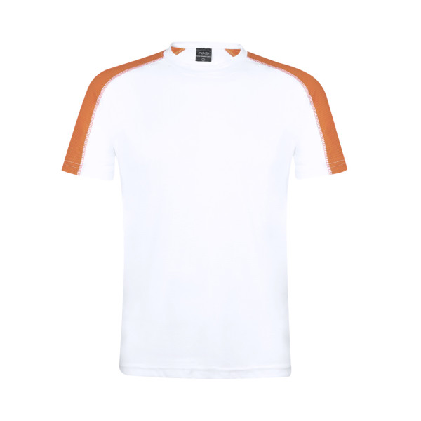 T-shirt voor volwassenen, dynamisch materiaal, goed ademend en bestaat uit 100% polyester 135g/m2. In een origineel wit design, met gekleurde strepen op de mouwen. Verkrijgbaar in verschillende kleuren en maten: S, M, L, XL, XXL.