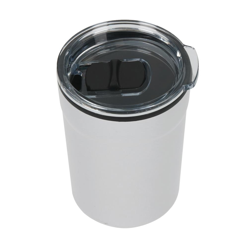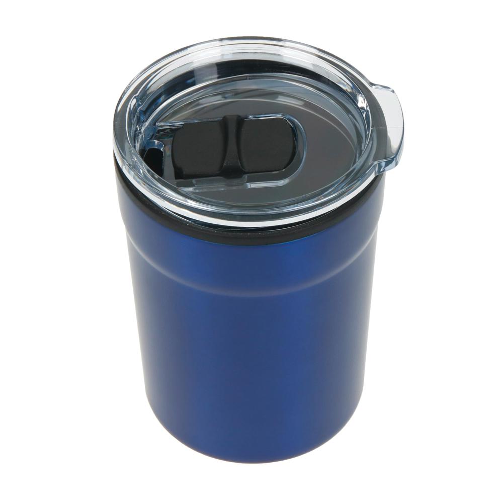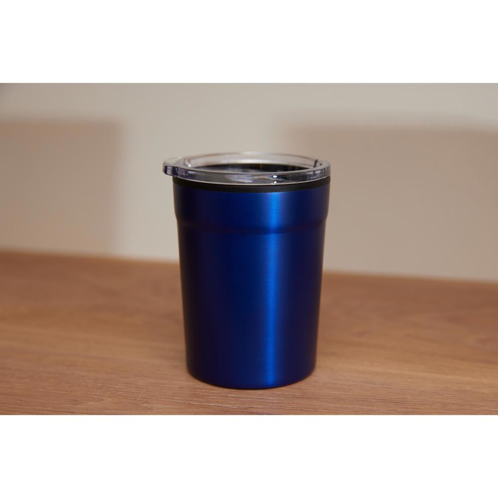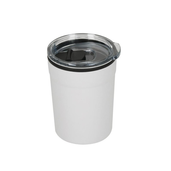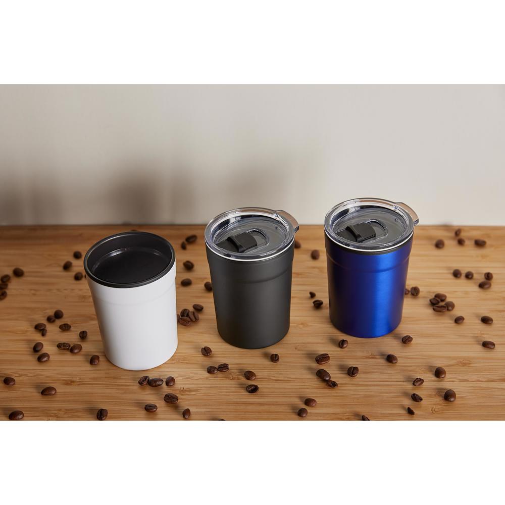 Kleine, dubbelwandige koffiebeker die onder alle gangbare koffiemachines past. Buiten van roestvrij staal en met een kunststof deksel om op te klikken inclusief sluitschuif. Inhoud: 0,15 liter.