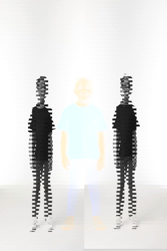 100% voorgekrompen ringgesponnen katoen (Sport grey: 90% voorgekrompen ringgesponnen katoen / 10% polyester. Jersey steek. Fijne ribkraag. Nektape van schouder tot schouder. Europese maatvoering. Zijnaden (3/4 en 5/6 jaar). Tubulaire snit (7/8 t/m 12/14 jaar). Afwerking met dubbele stiksels.