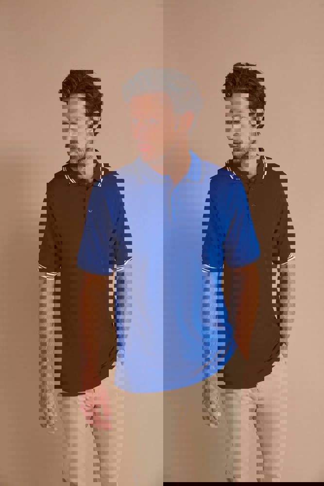 100% Coolplus® polyester. Micro piqué. Knooplijst met twee ton-sur-ton knopen. Kraag en mouwuiteinde in rib en contrastkleur. Zijsplitten.