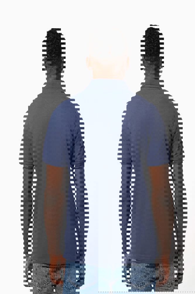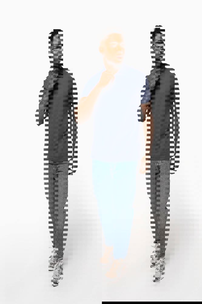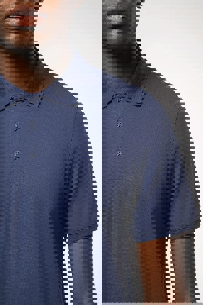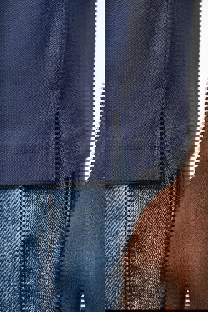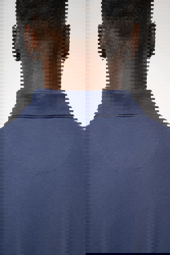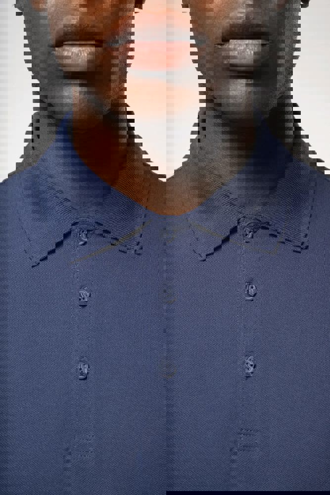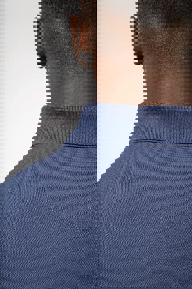 95% katoen / 5% elasthan. Piqué. Kraag in ribboord met nektape. Knooplijst met 3 knopen. Mouwen afgewerkt met ribboord. Kleine zijsplitjes en afgewerkt met dubbel stiksel aan de onderkant.