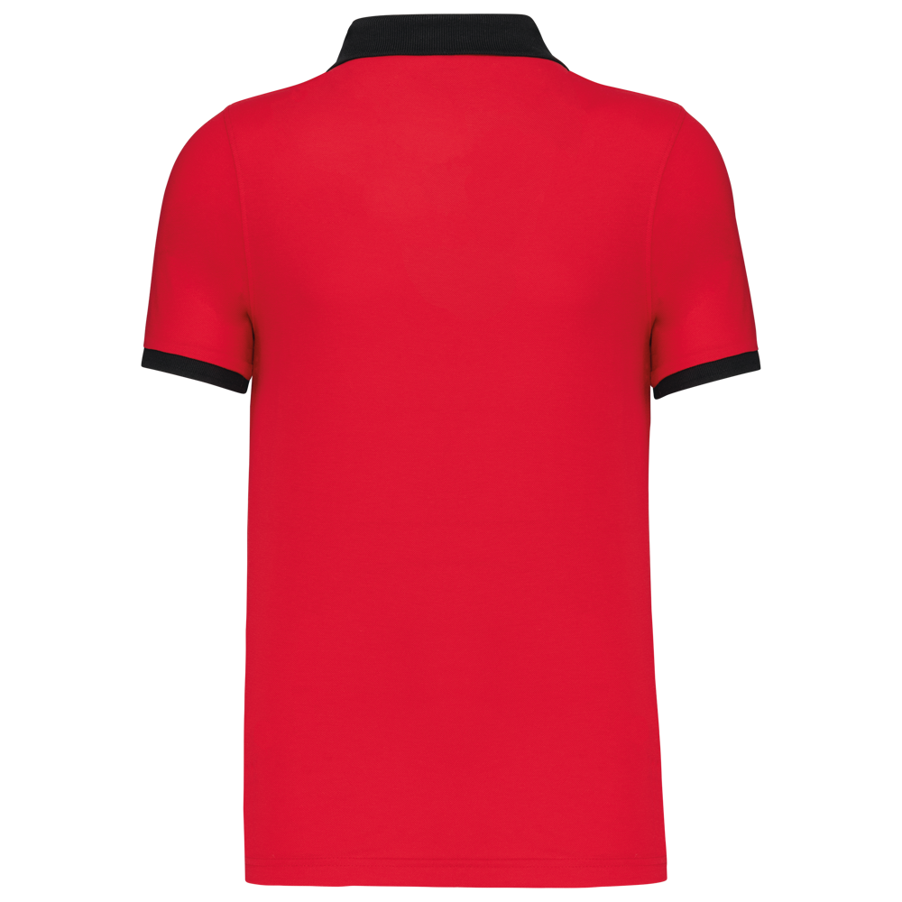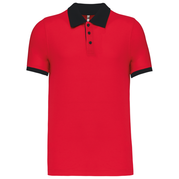 100% voorgekrompen katoen piqué (Oxford Grey: 90% katoen / 10% viscose). Contrasterende ribboord aan de kraag en mouwuiteinden. Contrasterende nektape. Aan de binnenzijde een contrasterende knooplijst met 3 knopen. Afwerking met dubbel stiksel onderaan.