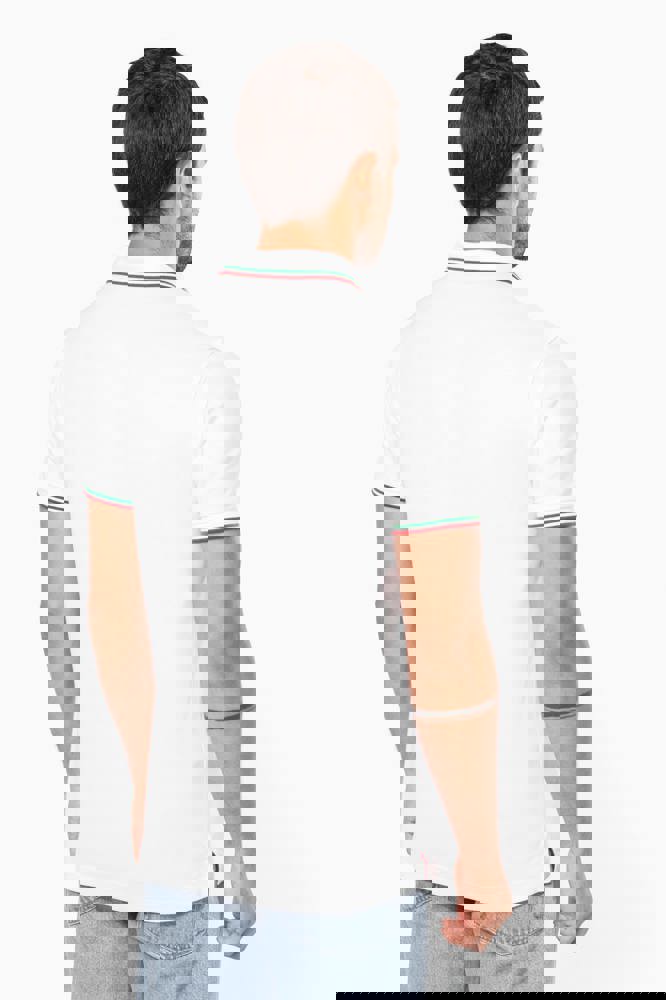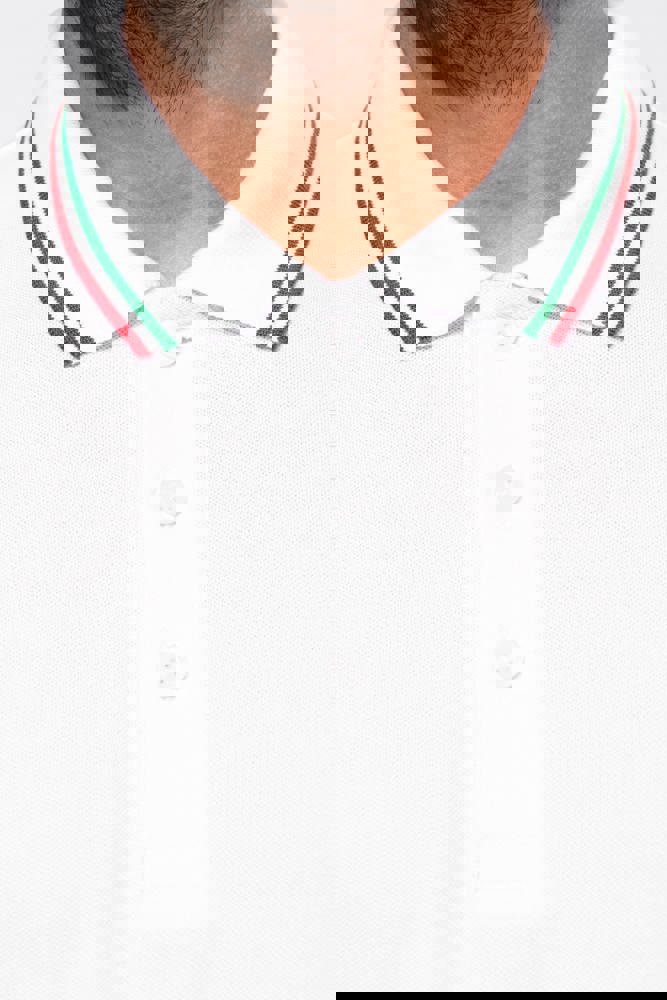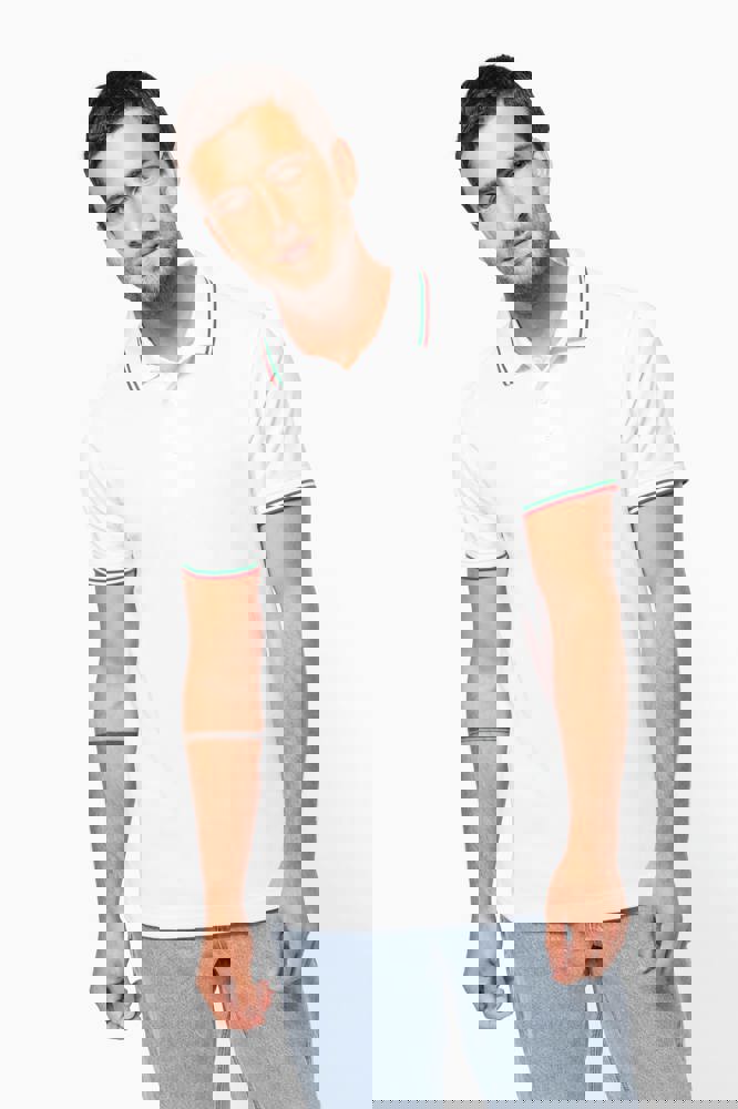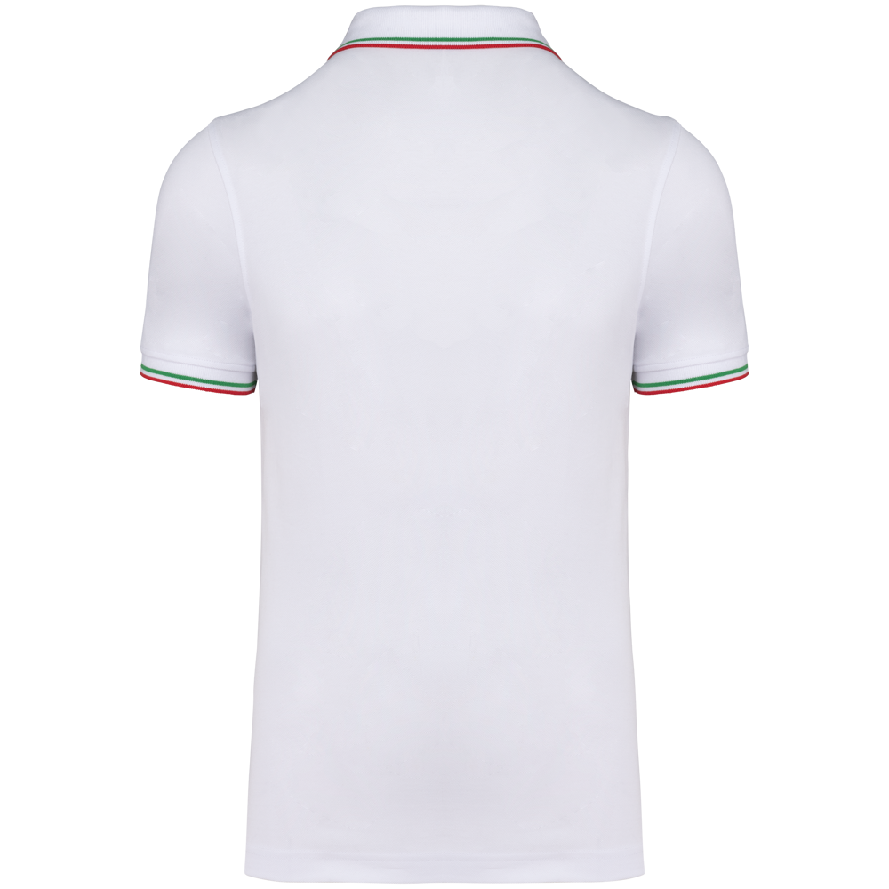 100% katoen piqué. Knooplijst met 3 knopen. Nektape en zijsplitjes in contrastkleur. Afwerking in rib met gecontrasteerde rand aan de kraag en mouwuiteinden. Afgewerkt met dubbele stiksels onderaan.