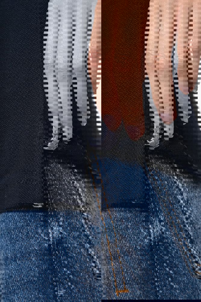 100% voorgekrompen katoen piqué (Oxford Grey: 90% katoen / 10% viscose). Contrasterende ribboord aan de kraag en mouwuiteinden. Contrasterende zijsplitten en nektape in de kraag. Aan de binnenzijde een contrasterende knooplijst met 4 knopen. Afwerking met dubbel stiksel onderaan.
