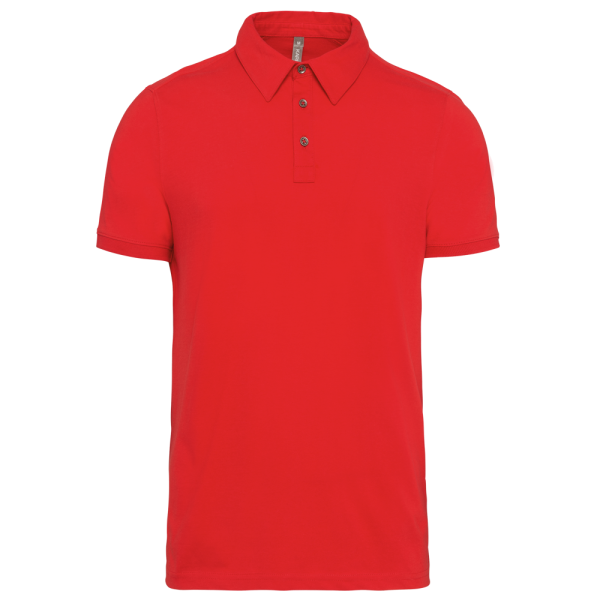 100% gekamd katoen (French Navy Heather: 80% katoen / 20% polyester - Grey Heather: 65% polyester/35% katoen - Oxford Grey : 90% katoen / 10% viscose). Jersey. Hemdskraag. Knooplijst met 3 metalen knopen. Inzetstuk op de schouder. Afgewerkt met ribboord aan de mouwuiteinden. Dubbel stiksel aan de onderkant.