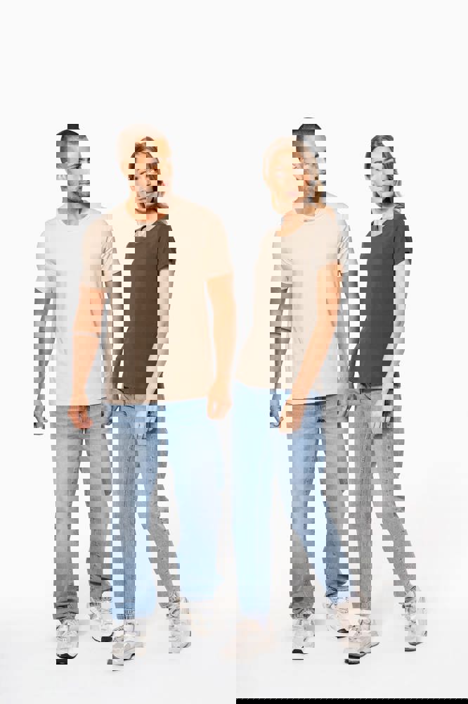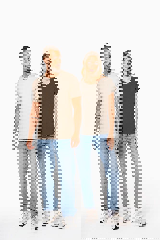 97% katoen / 3% elasthan. Chiné kleuren: 87% katoen / 9% viscose / 4% elasthan. Ronde hals. Dubbel stiksel aan mouwuiteinden en onderkant. De moderne getailleerde snit zijn volgens de laatste modetrends.
