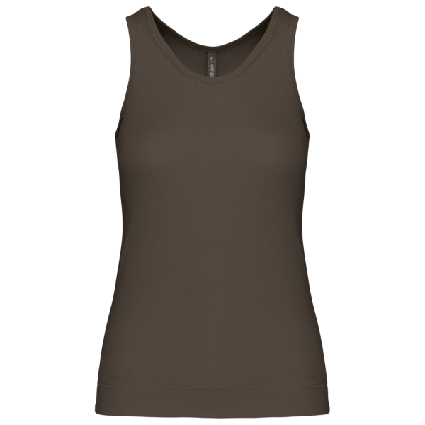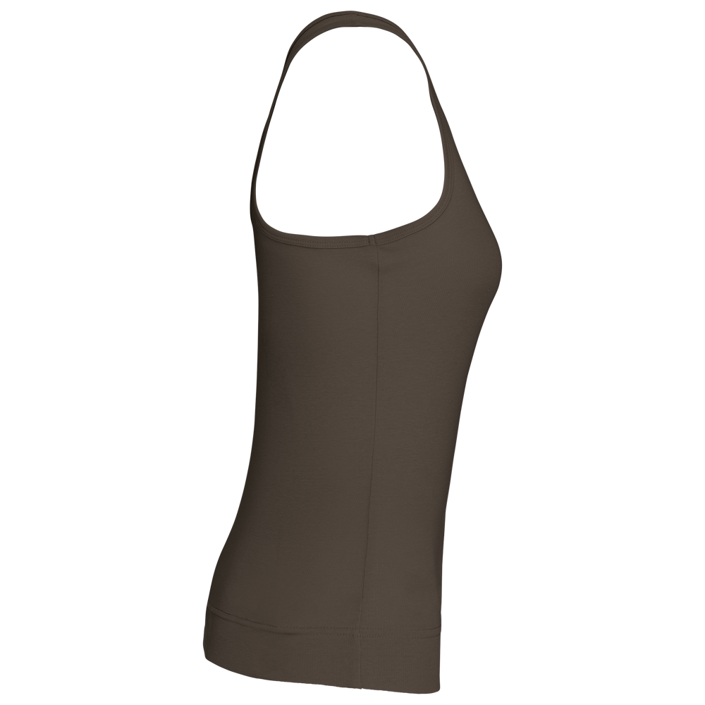 100% katoen 1x1 rib. Racerback. Afwerking met dubbele stiksels.