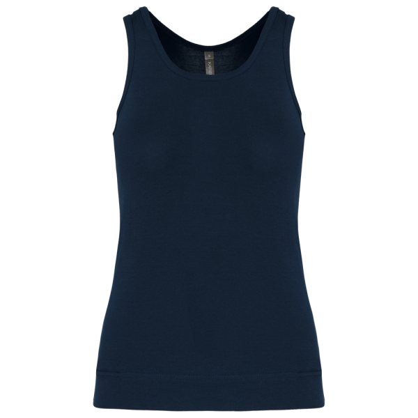 100% katoen 1x1 rib. Racerback. Afwerking met dubbele stiksels.