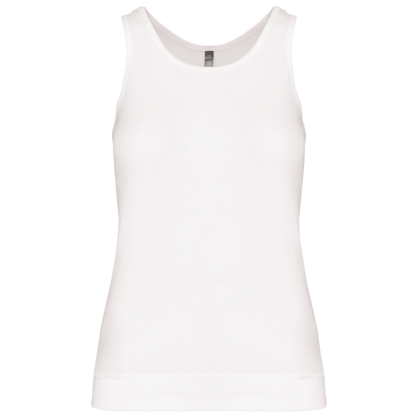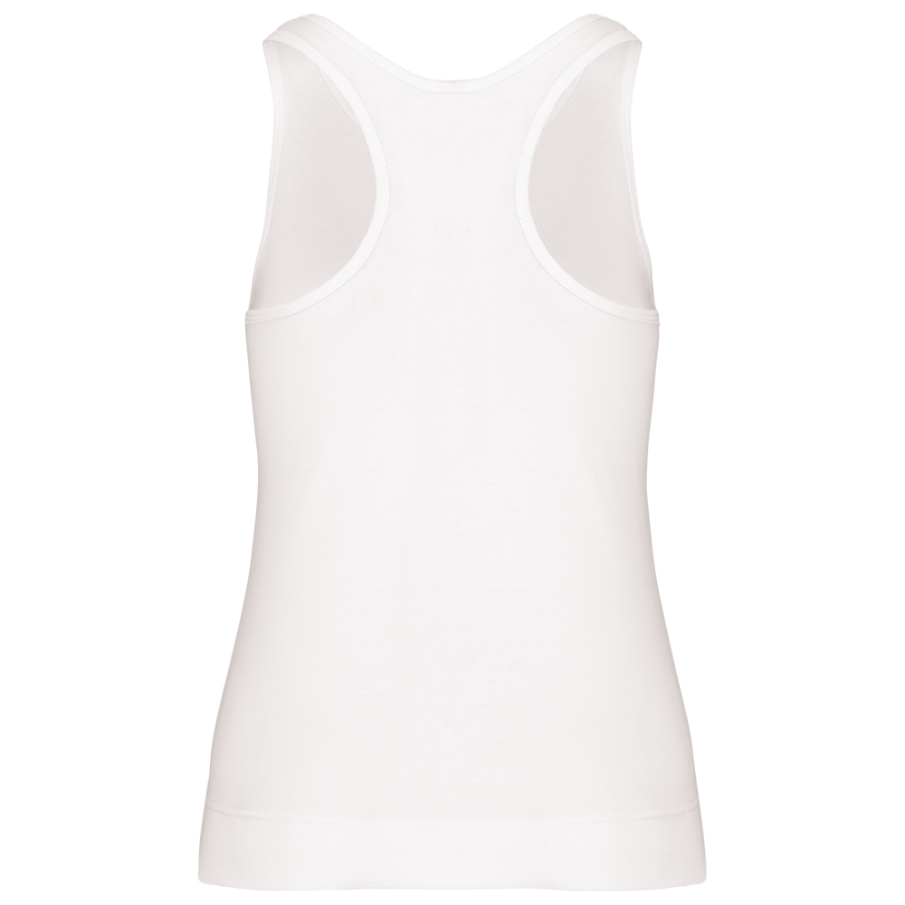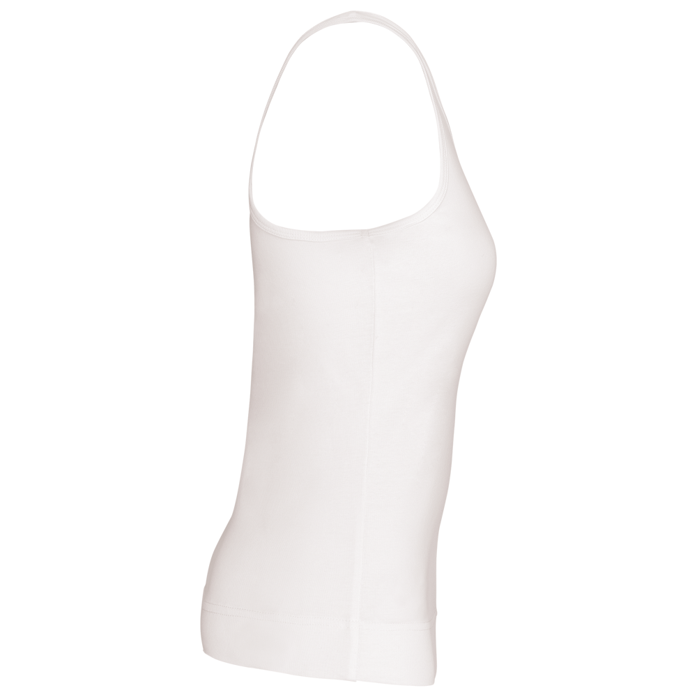 100% katoen 1x1 rib. Racerback. Afwerking met dubbele stiksels.