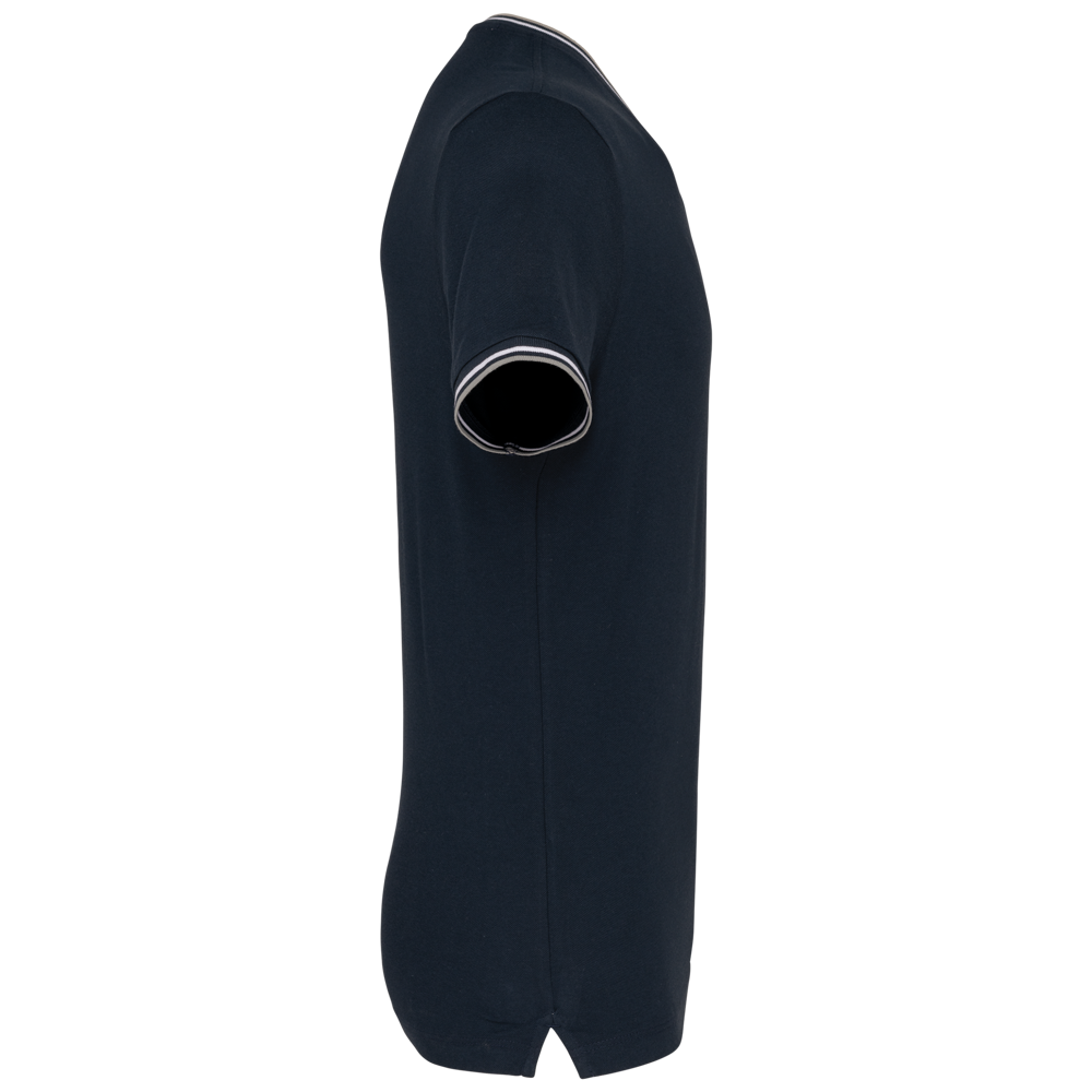 100% gekamd katoen piqué (Oxford Grey: 90% katoen / 10% viscose). Ribboord met contrasterende strepen aan de kraag en mouwuiteinden. Contrasterende zijsplitten en nektape in de kraag. Afwerking met dubbel stiksel onderaan.